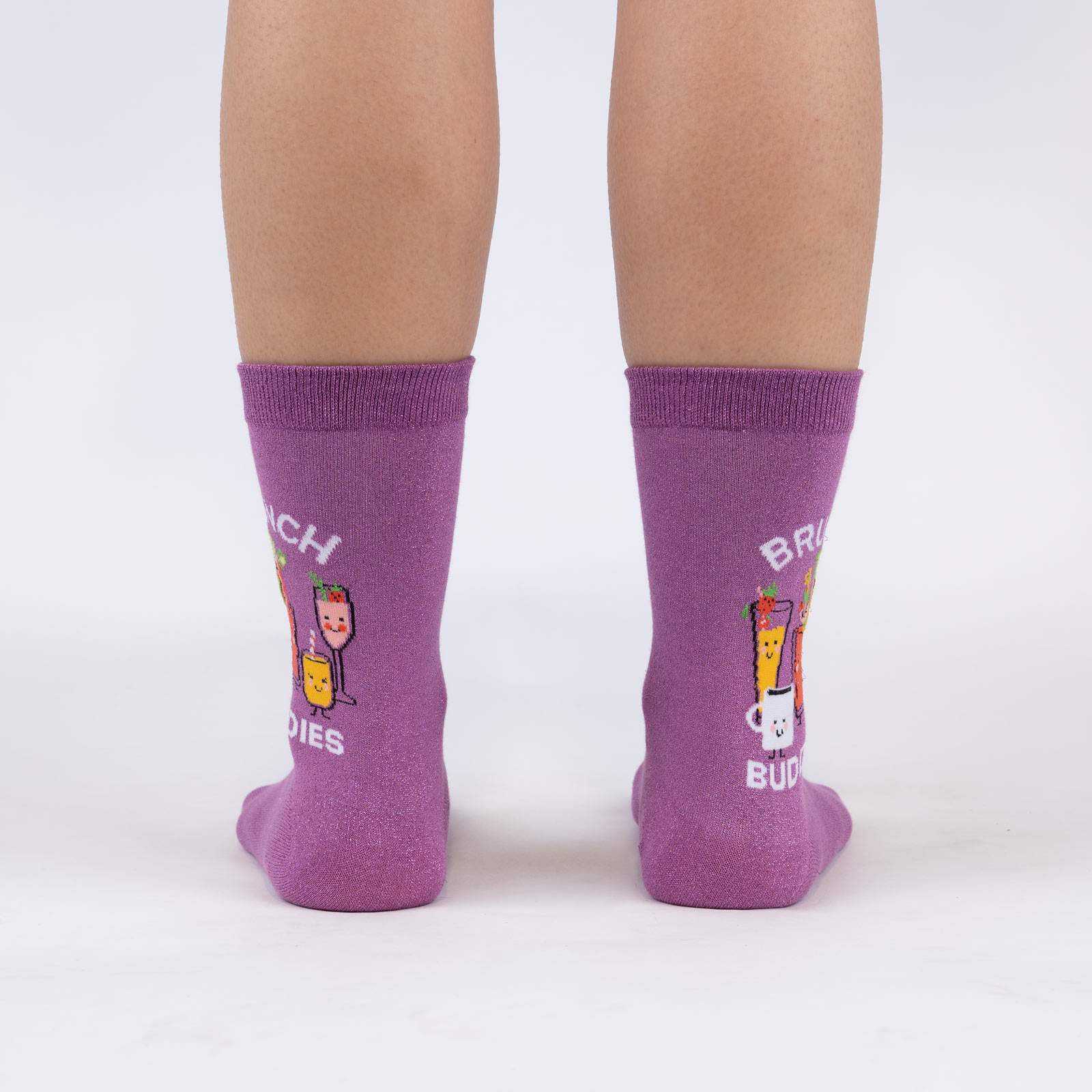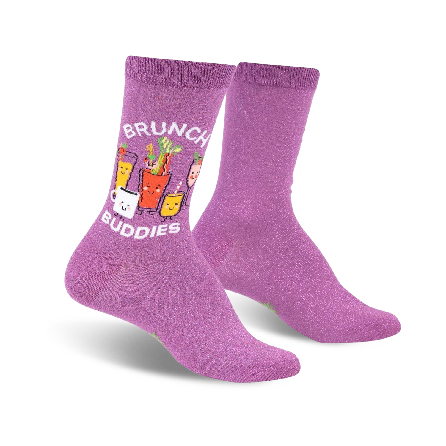 Kickstart your day with a brunch date with three boozy besties a winkin' cup of coffee, a cheeky bloody mary, and a mimosa with a citrusy grin. These shimmery purple crew socks will remind you that life is always better with brunch buddies! They're the perfect accessory for your next brunch party or a lazy Sunday morning at home.