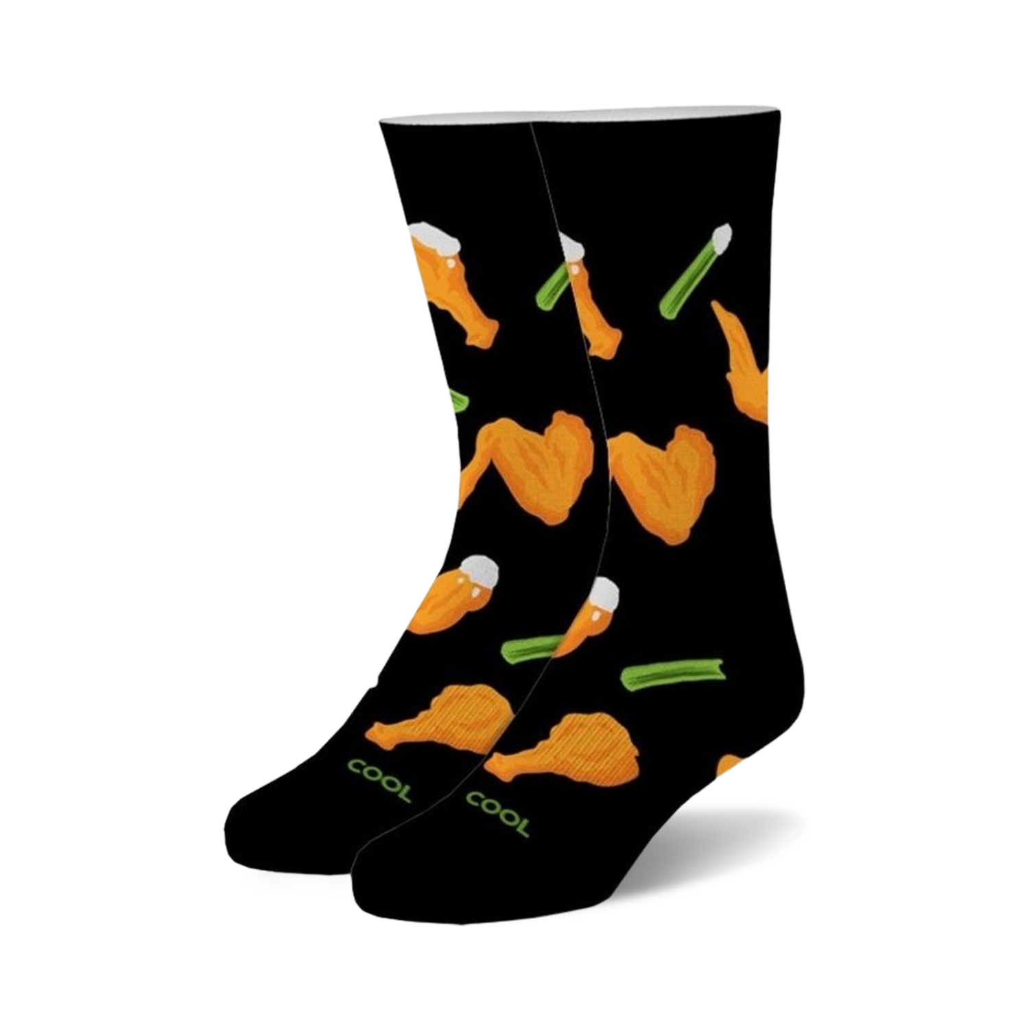 Meet Buffalo Wings, the crew socks that'll make you crave pub grub. Don these socks and you'll be the hit of any tailgate or beer garden. Whether you're a Bills fan or just a fan of finger food, these socks are sure to turn heads. With their bold pattern of buffalo wings, celery sticks, and beer mugs, they're guaranteed to spark a conversation. Just don't wear them to a vegan potluck.