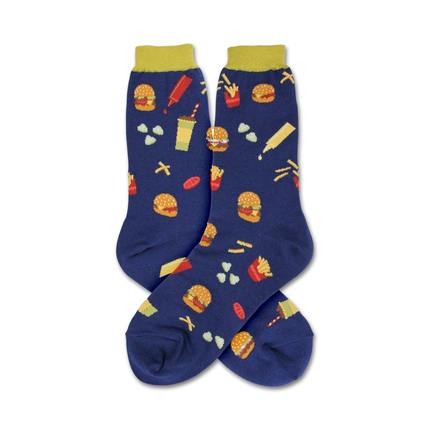 Craving some tasty fashion with a side of fun? Look no further than our Burgers socks! Picture this: a dark blue backdrop adorned with a ketchup-stained fast food feast. Burgers, fries, and condiments galore, all served up in deliciously soft, durable cotton. These socks aren't just a fashion statement; they're a tasty tribute to your favorite flavors. So go ahead, indulge in your sock-wearing cravings and let your feet do the feasting.