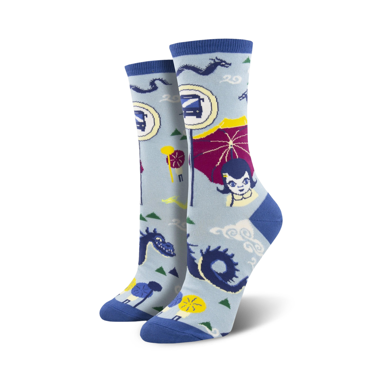 Hop on the bus to Funky Town with these crew socks for women. These playful blue socks feature a whimsical pattern of buses, clouds, dragons, and a girl in a traditional Chinese dress holding a yellow umbrella. Perfect for adding a touch of fun to your everyday style. They'll have you feeling as free as a bird, even when you're stuck at the bus stop.