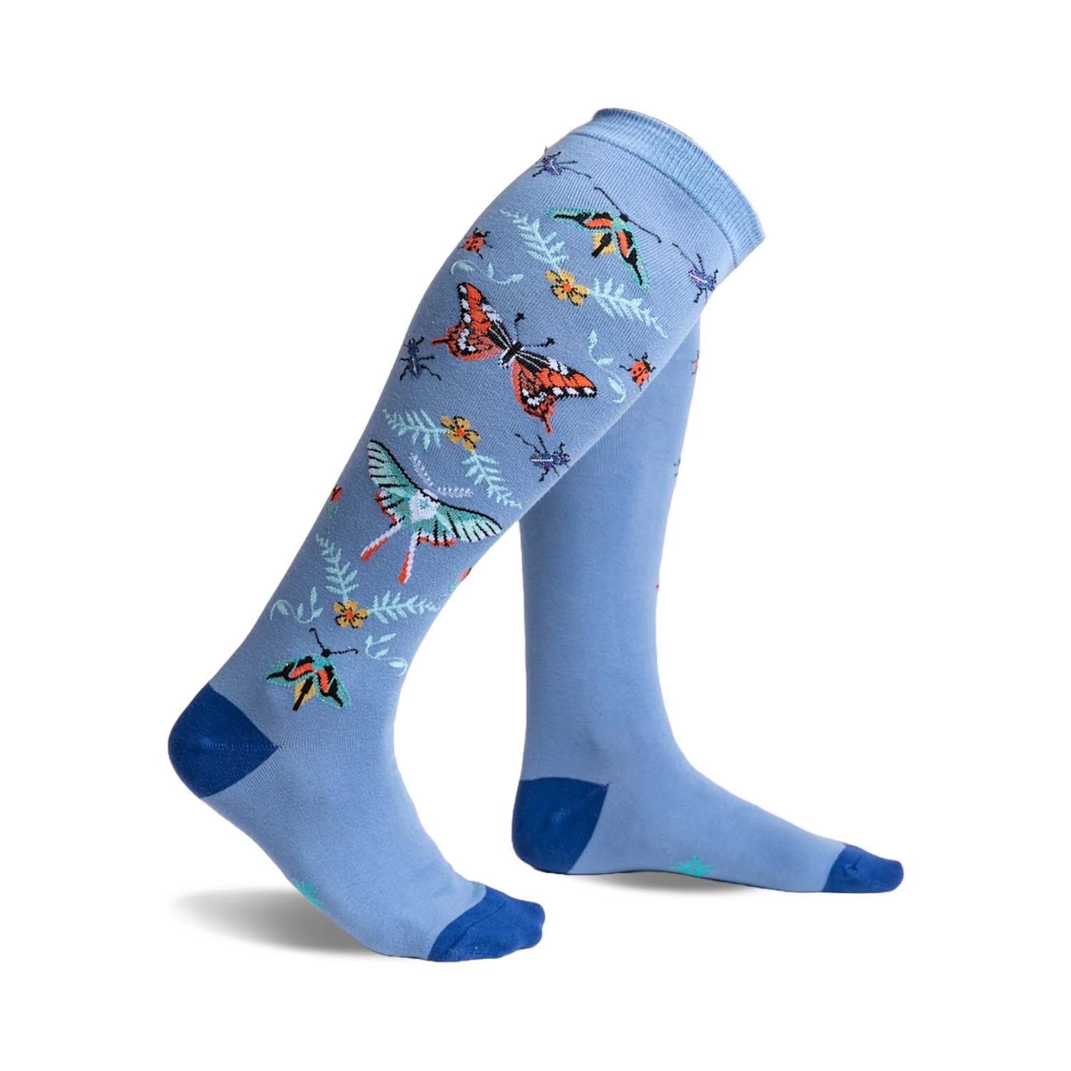 Meet Butterfly In The Sky, the knee-high socks for women that are sure to put a spring in your step! Soar through your day with these vibrant socks featuring butterflies, moths, and other delightful flying insects, flitting about a blue backdrop. With a burst of colors like orange, green, yellow, and black, these socks are a feast for the eyes. With every glance, you'll feel uplifted by the resilience and beauty of nature. Get ready to take flight with Butterfly In The Sky!