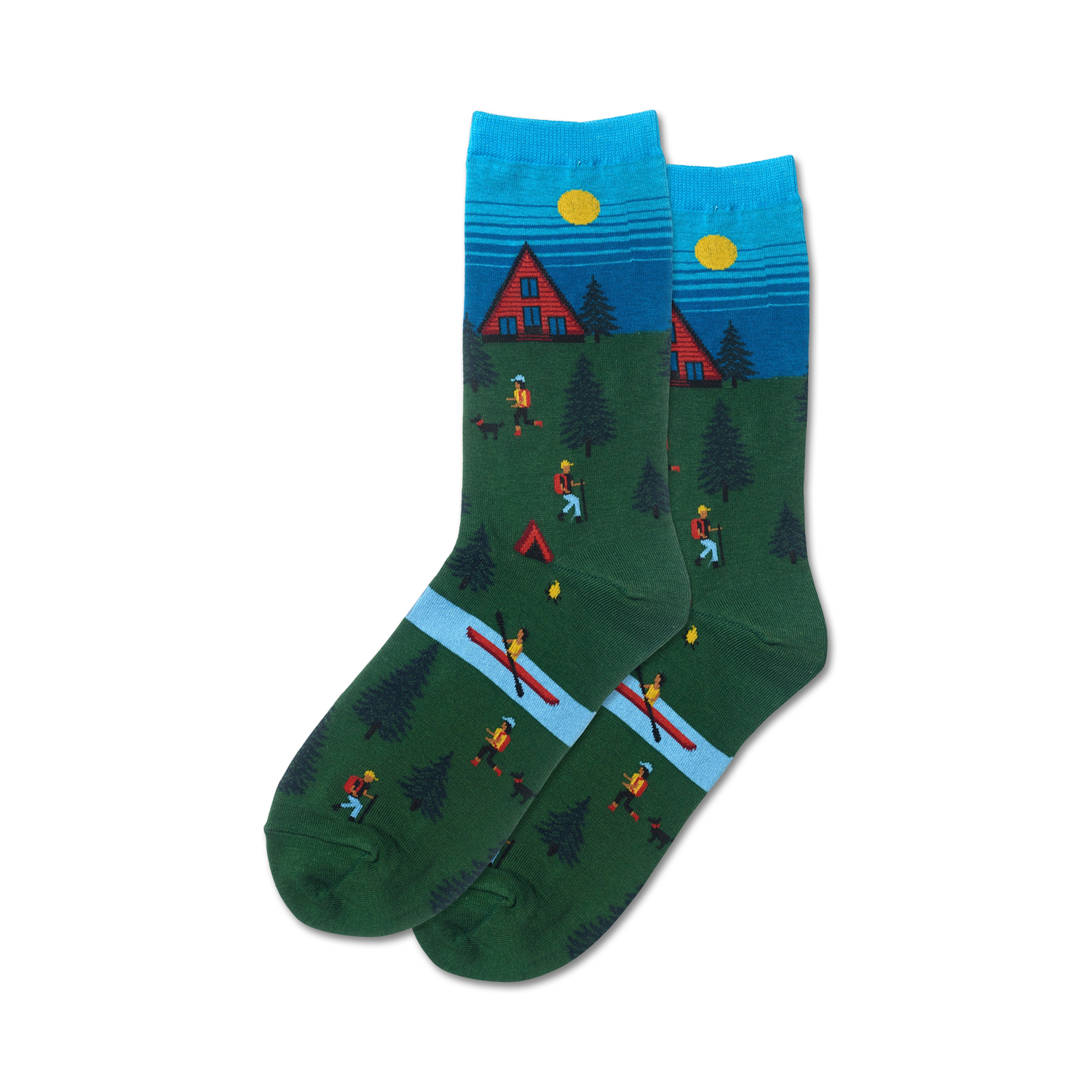 Kick your feet up in these cozy Cabin Scene socks and get lost in a serene winter wonderland. Imagine the crunch of snow beneath your feet as you take a hike through the woods, the gentle rush of the river as you cast your line, and the warmth of a crackling fire as you settle in for a night under the stars. With their vibrant green hues and intricate details, these socks will transport you to your own private cabin retreat, no matter where you are.