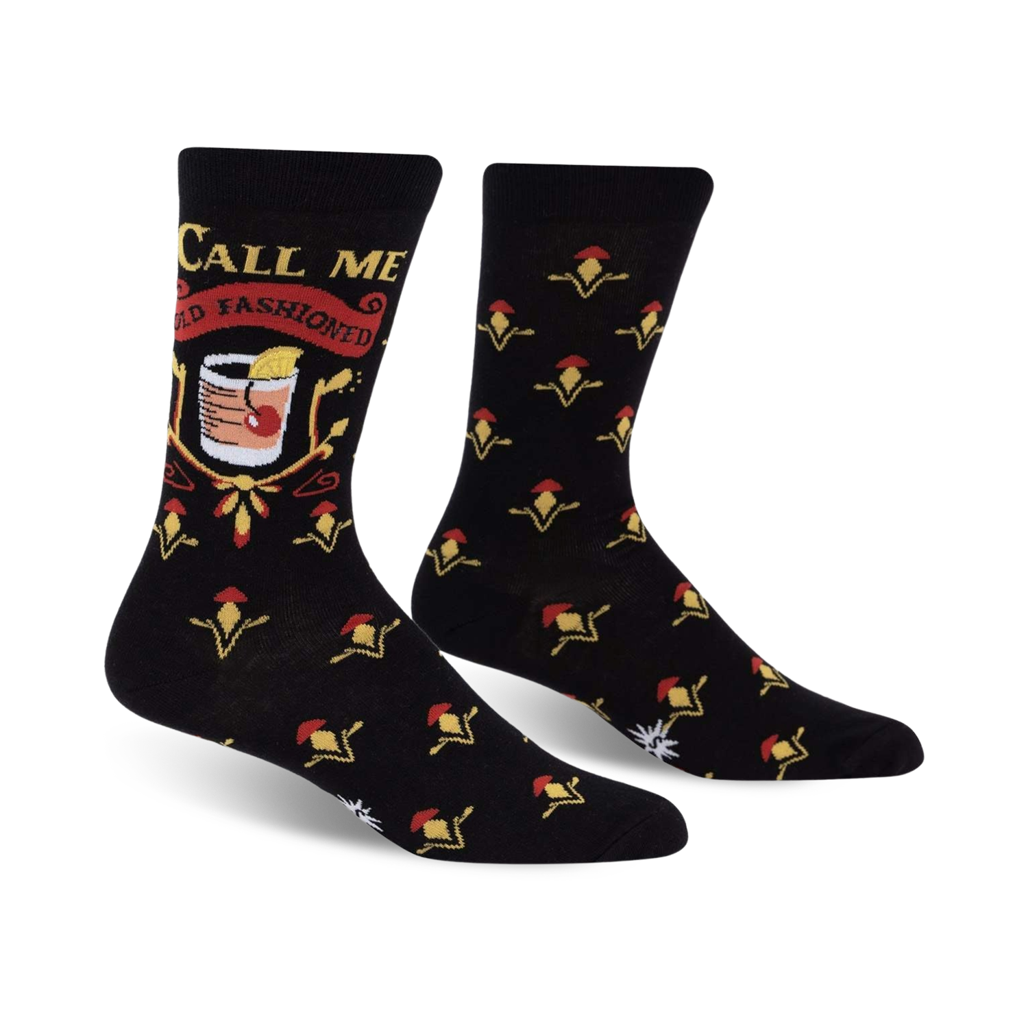 Peep these fly socks, straight outta a classic cocktail! Rock 'em when you're sippin' an old fashioned or just feeling nostalgic. Featuring a black backdrop, vibrant yellow flowers, and a pop of red, these crew socks for men are a quirky conversation starter. Let your feet do the talkin' and take a sip of style with these boozy beauties!