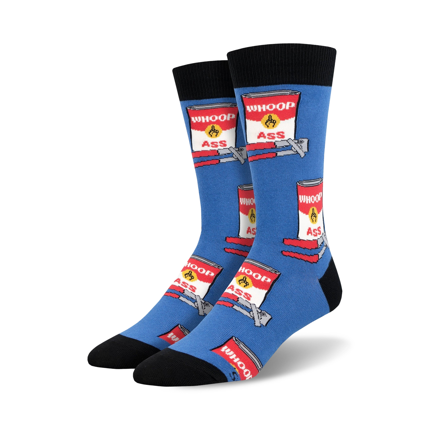 Bright blue crew socks are definitely not for the faint of heart. They're covered in bold, pop-art style cans, designed to look like they've seen some action. Each red and white can prominently features 'WHOOP' at the top and 'ASS' at the bottom, with a little yellow burst shape in the middle, implying an explosive force. Below each can, there's a visible grey and white shape, like a bent metal bar, adding to the no-nonsense vibe. With black cuffs, heels, and toes, these socks promise to make a statement wherever you stomp. They're all about that unapologetic, ready-for-anything energy.