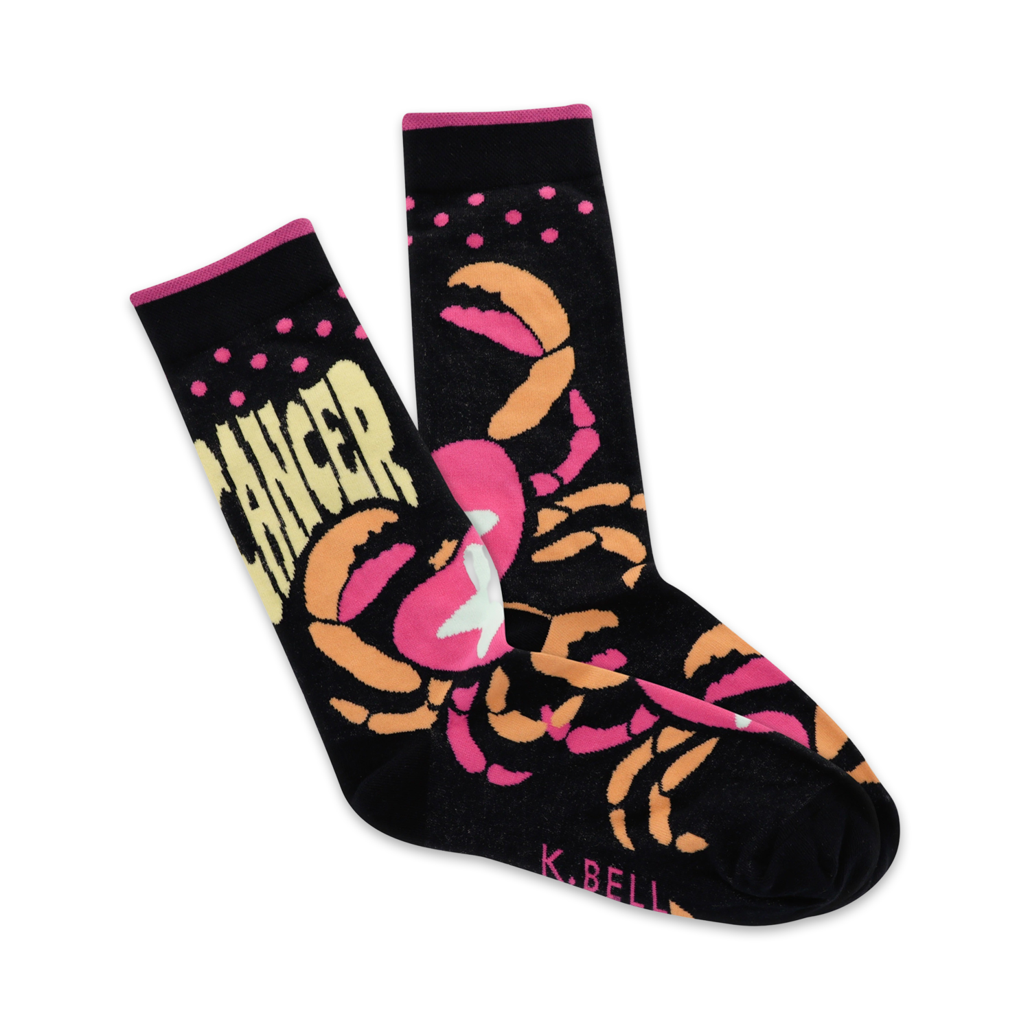 Crabby, funny, and bold. Show off your zodiac sign with these black, crew-length, women's socks featuring a pattern of pink and orange crabs and pink polka dots. The word "CANCER" is written in large, white letters boldly displayed on the top of the socks -- perfect for proud, strong Cancerians. Like a crab, these socks will feel like home whether you're seaside or going about your day.