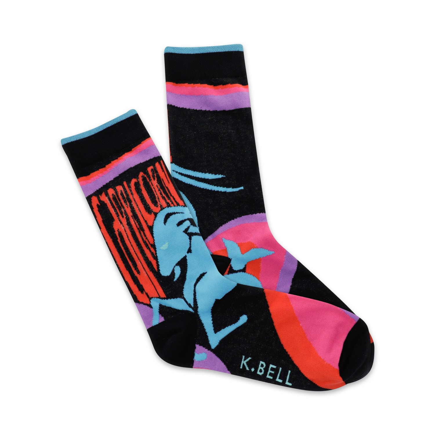 They say you can't judge a book by its cover, but what if your socks told a different story? Meet Capricorn, a sock that was designed to turn heads like you're the main character in a Wes Anderson film. This sock features a blue goat with a red horn and a red tail, surrounded by pink, blue, and red geometric shapes. Even your toes will thank you for this funky adventure!