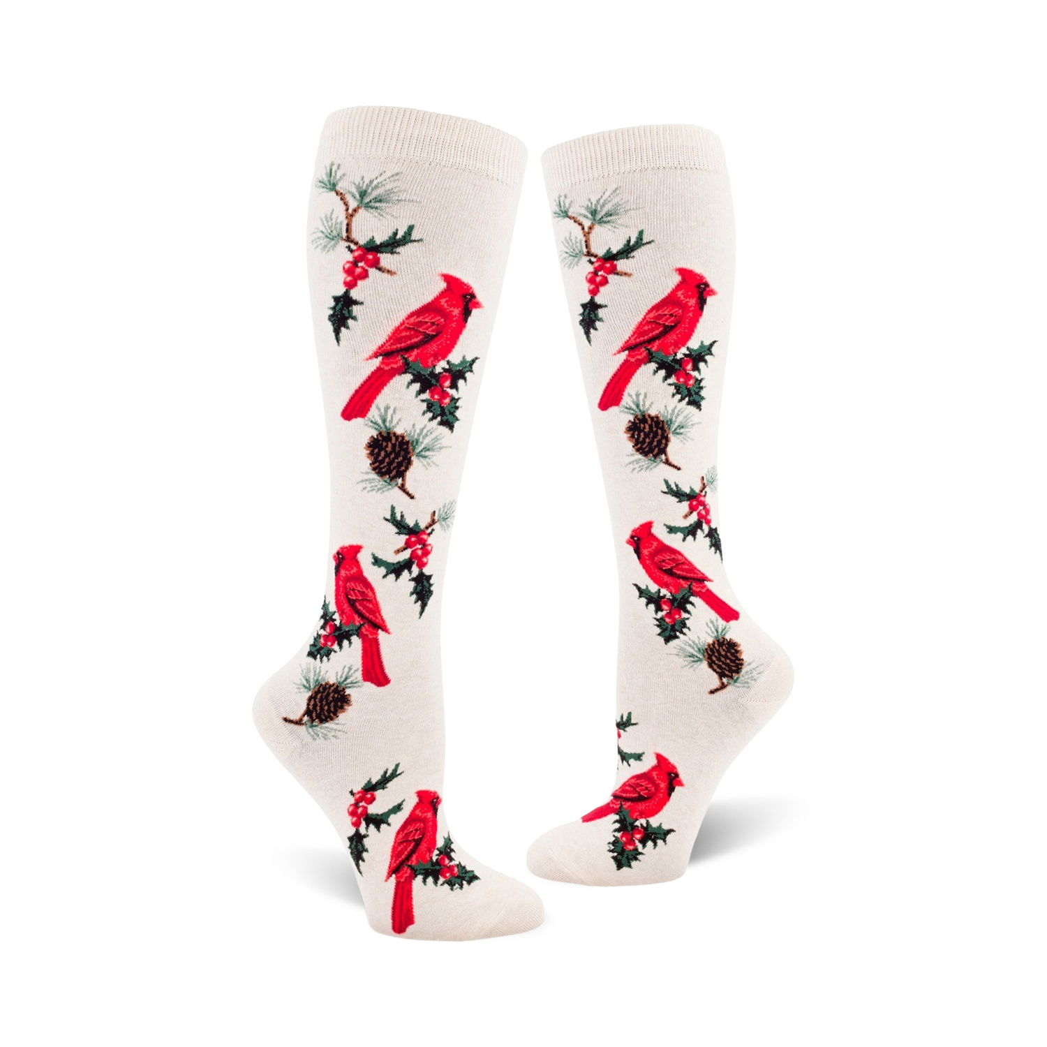 Who says your feet should be bland? These Cardinal Knee High Womens Socks are so merry and bright you may even think they're singing. Featuring a festive pattern of red cardinals, green pine boughs, and red berries, they're sure to bring a dash of joy to your day. Plus, when people ask about them, you'll have the perfect excuse to start belting out a Christmas carol. And, best of all, they're as comfy as a warm winter fire.