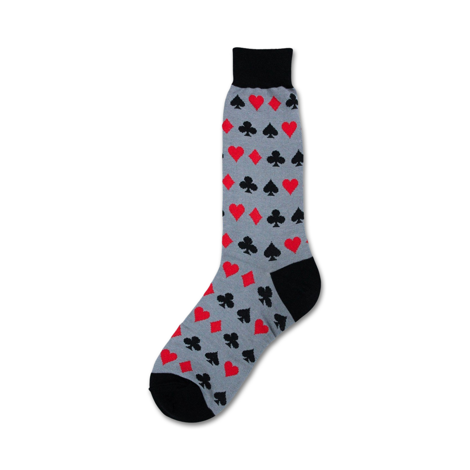 Forget the Royal Flush, it's time for the sock flush! Deal yourself a fresh hand with these gray Cards crew socks. The vibrant pattern of red and black card suits is almost as fun as a game of poker ” almost. Say "Hasta la vista, baby" to boring sock and level up your sock game to mens gaming wonderland.