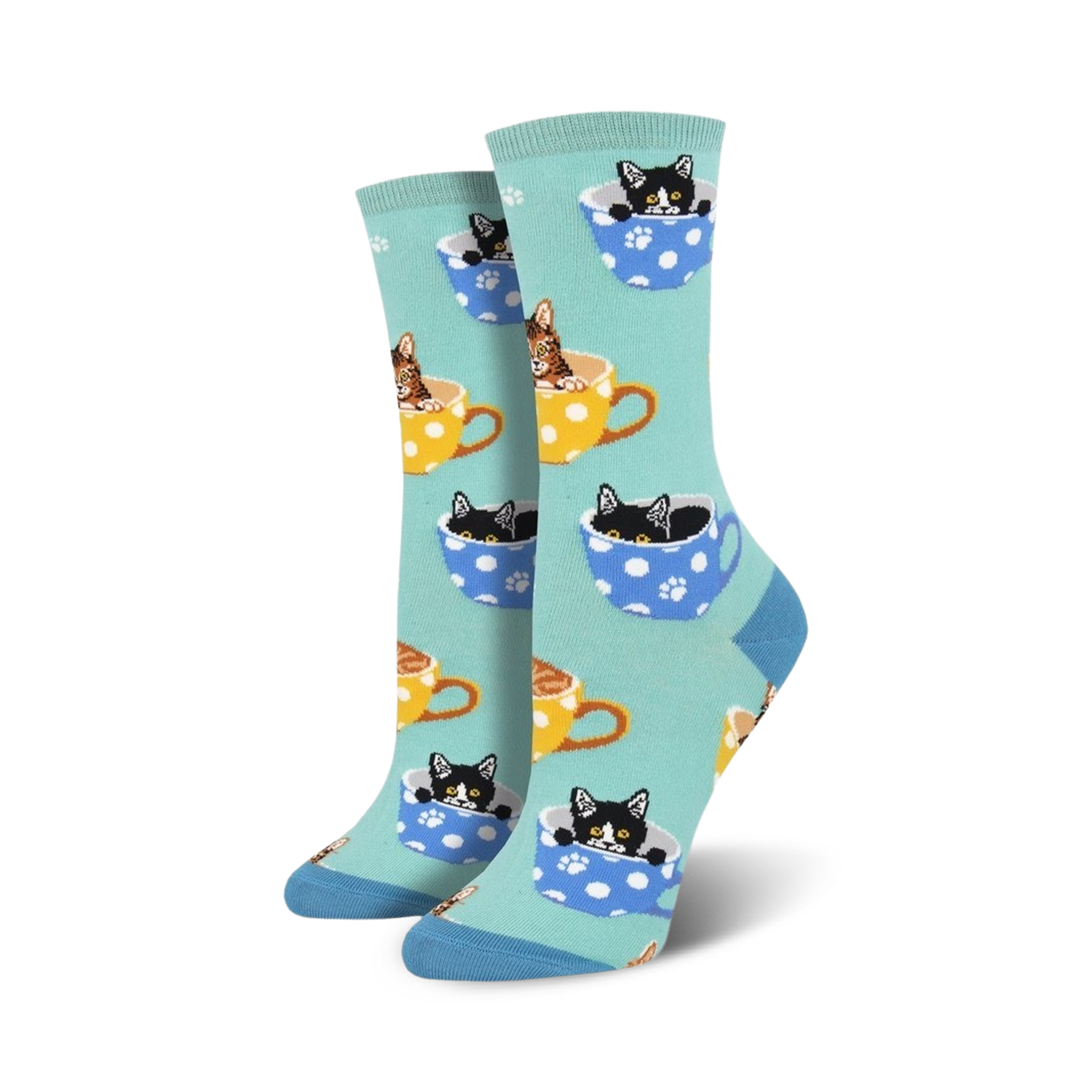 These meow-velous Cat-Feinated socks will fur-ociously brighten your day! These light brown crew socks feature a pattern of pink polka dot tea cups with cats tucked cozily inside. You'll be feline fine and looking extra dapper once you slip these adorable cat-titude socks on your feet.