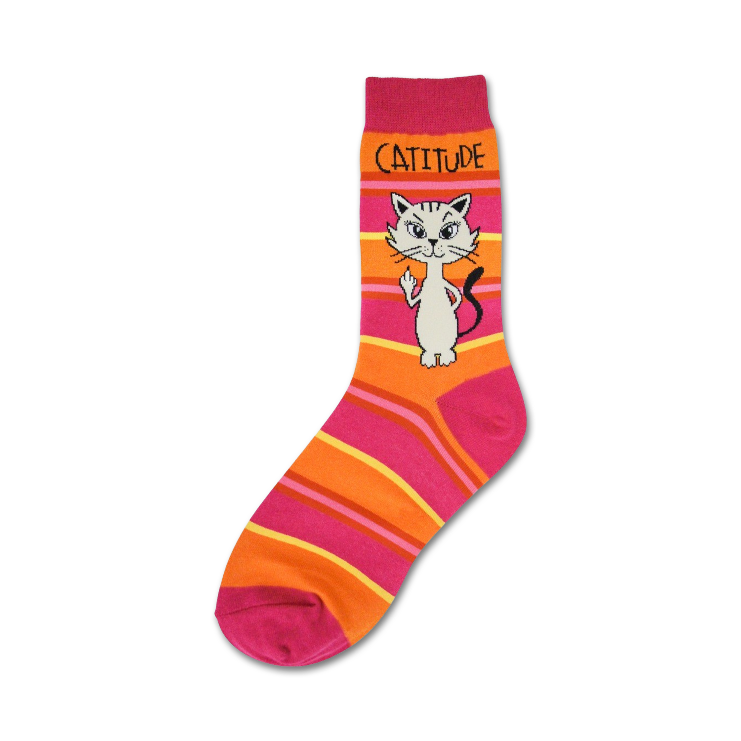 Cattitude socks are the purrfect accessory for any cat lover. These crew socks feature a bold pink and orange stripe with a cheeky cartoon cat giving the middle finger and the word "Cattitude" written across the top. Whether you're looking to add a touch of sass to your everyday look or just want to show off your love for cats in a fun and playful way, these socks have got you covered (literally). So, put some cattitude in your step and grab a pair today, meow!