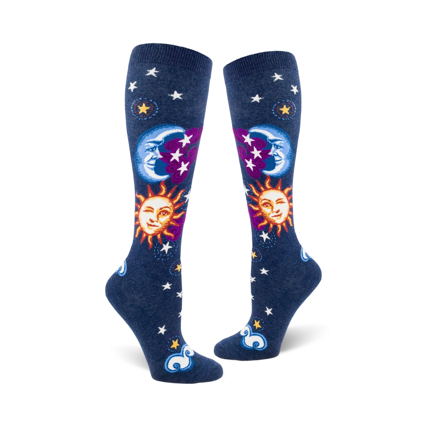 Celestial socks for women! If the sky is the limit, let your kicks do the star-spangled soaring! Our Celestial socks are blue knee-highs covered in a constellation of white stars, moons, suns, and puffy clouds. Brighten gloomy days with these space socks and feel the cosmos on your calves!