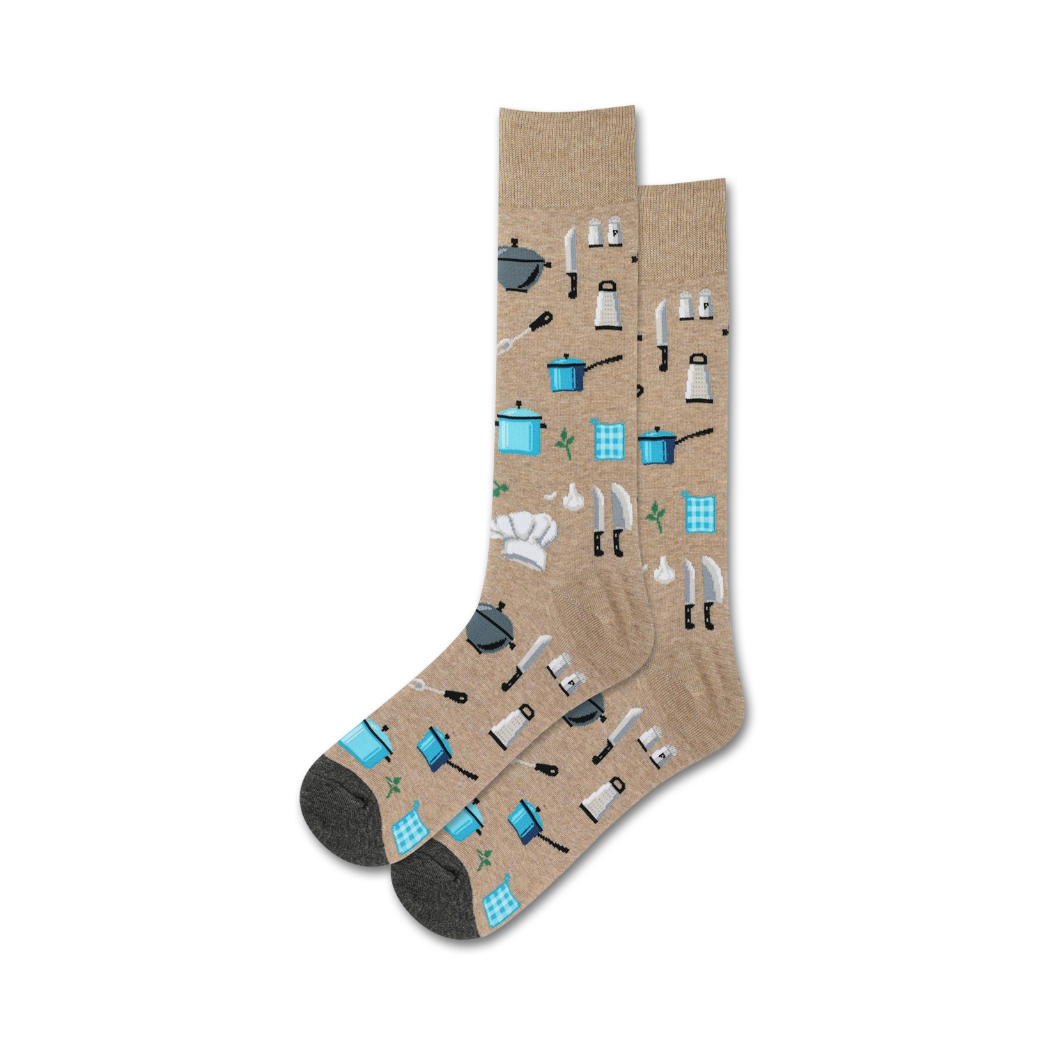 Spice up your sock drawer with our Chef Tools socks! These crew socks are shown in a vibrant blue and a more subdued beige. The visible pattern features a fun mix of kitchen tools- pots, pans, knives, and a chef's hat. They're comfy, they're quirky, and they're perfect for anyone who loves to cook or just appreciates a good design. The toes and heels shown have a slightly contrasting color. Get ready to show off your culinary side, one stylish step at a time.