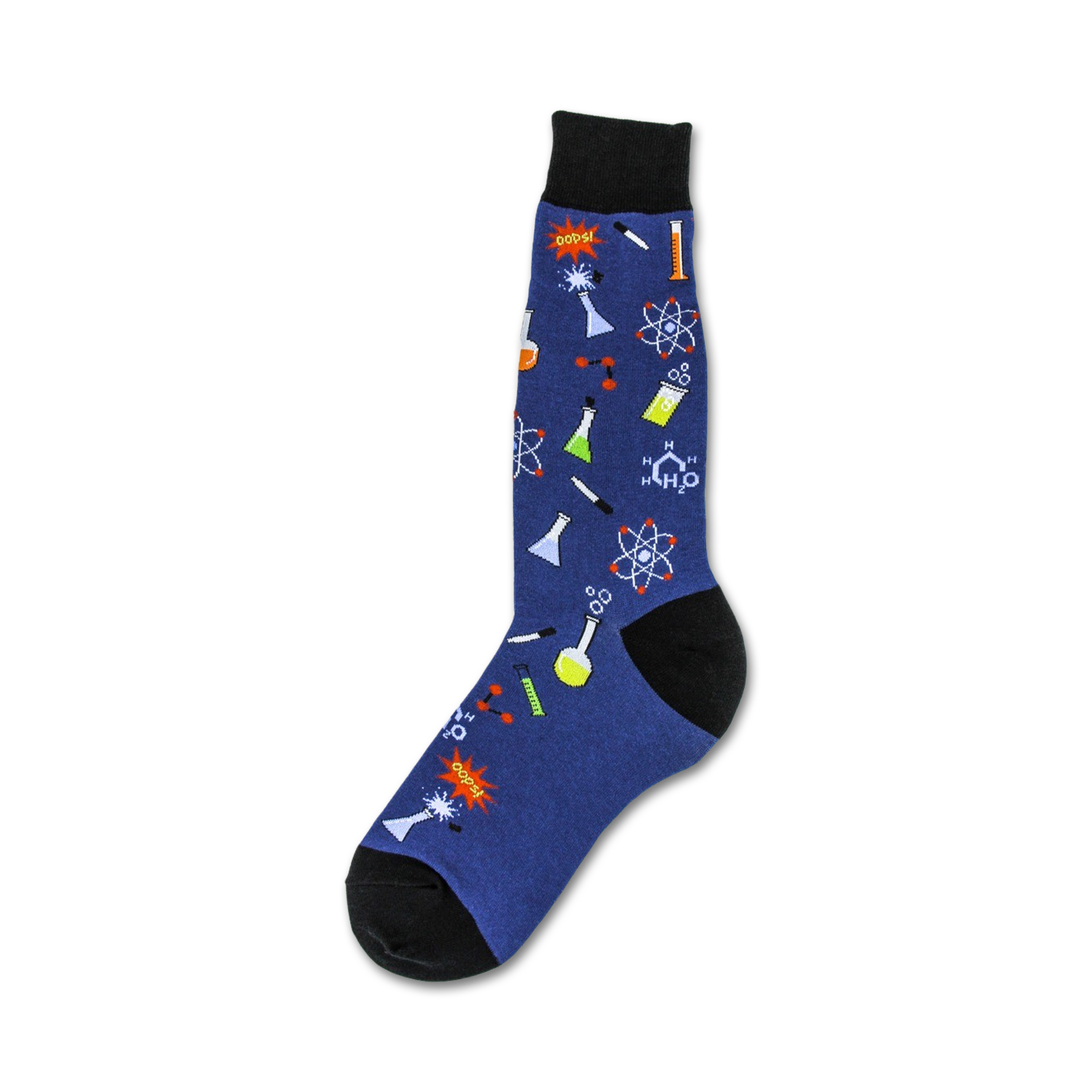 Chemistry: Get your beaker-ing act together and test your limits with these super cool crew socks! Featuring a vibrant blue backdrop with beakers, test tubes, flasks, and atoms, these socks are the perfect blend of science and style. Whether you're a chemistry whiz or just love geeking out on the periodic table, these socks will surely make a statement. So don't be afraid to let your inner nerd shine through and rock these Chemistry socks with pride!