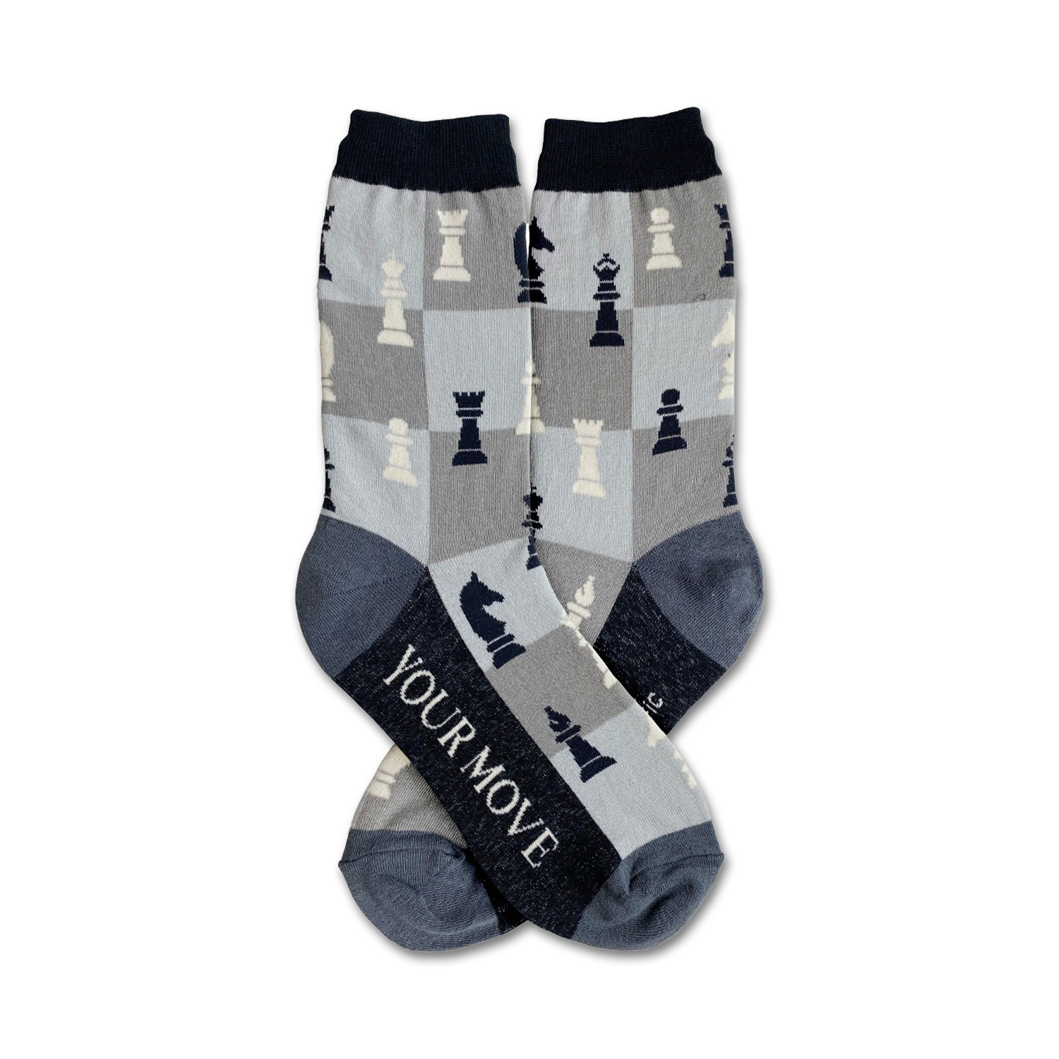Checkmate! Your next move in the fashion game is a pair of these cozy gray crew socks with a chessboard pattern. The words "YOUR MOVE" at the bottom of the left sock will have your opponents thinking twice before making their next move. These socks are perfect for any chess enthusiast, casual gamer, or anyone who loves a fun and unique pair of socks.