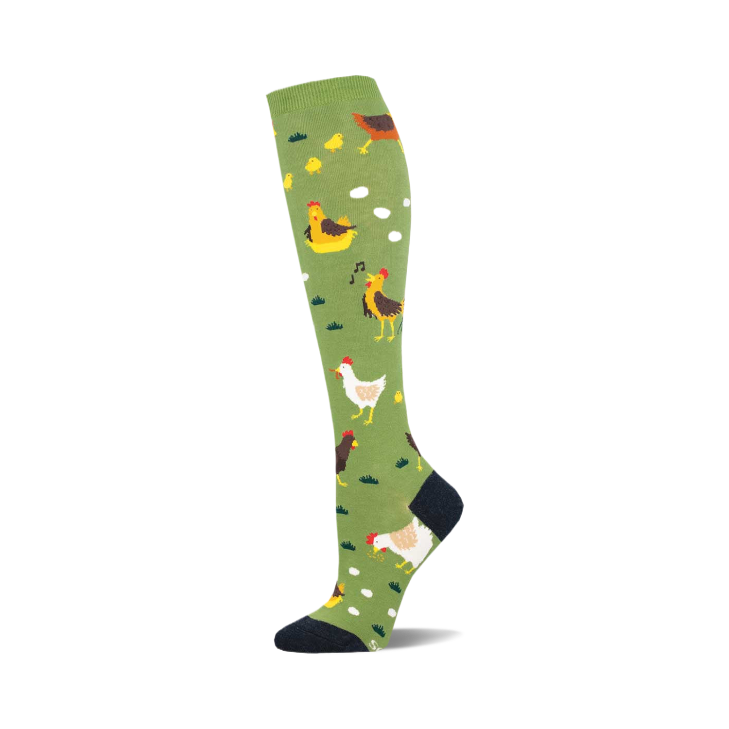Cluck, cluck! Who's ready to shake up their wardrobe with a bit of farmhouse flair? Meet the Chicken Ranch socks, a quirky addition guaranteed to bring a smile. Adorned with a playful pattern of chickens, chicks, eggs, and grassy patches, these crew-length socks are perfect for casual outings, cozy weekends, or surprising your favorite hen enthusiast. Why not give your feet a peck of style and bring the barnyard fun wherever you go?