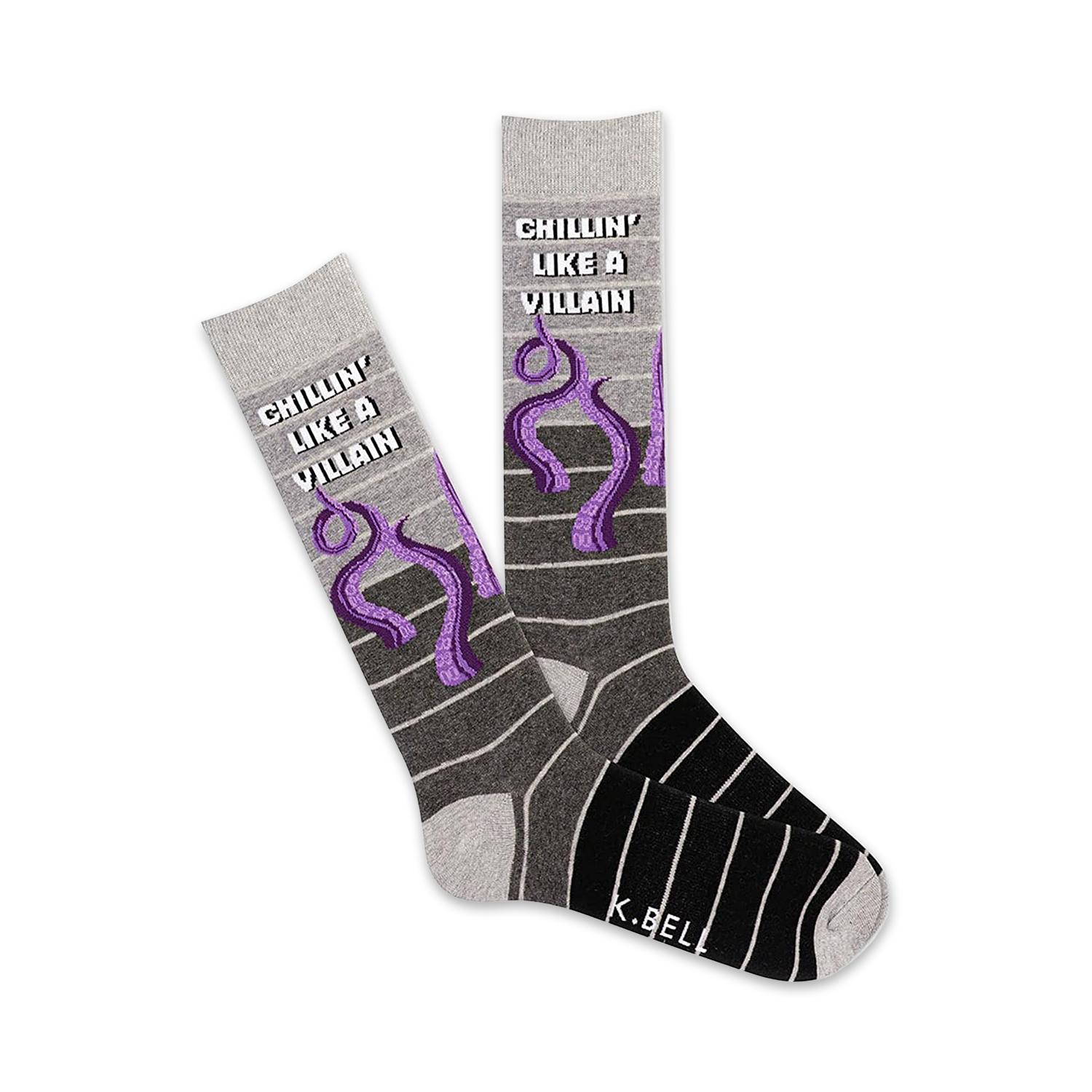 Calling all villains! Throw these 'Chillin' Like a Villain' socks on for the next caper. Stare down your arch nemesis without even breaking a sweat! These gray and black stripy crew socks with a purple octopus have the right balance of villainy and vibrancy. Who says you can't be a villain and have a little fun? Nobody.