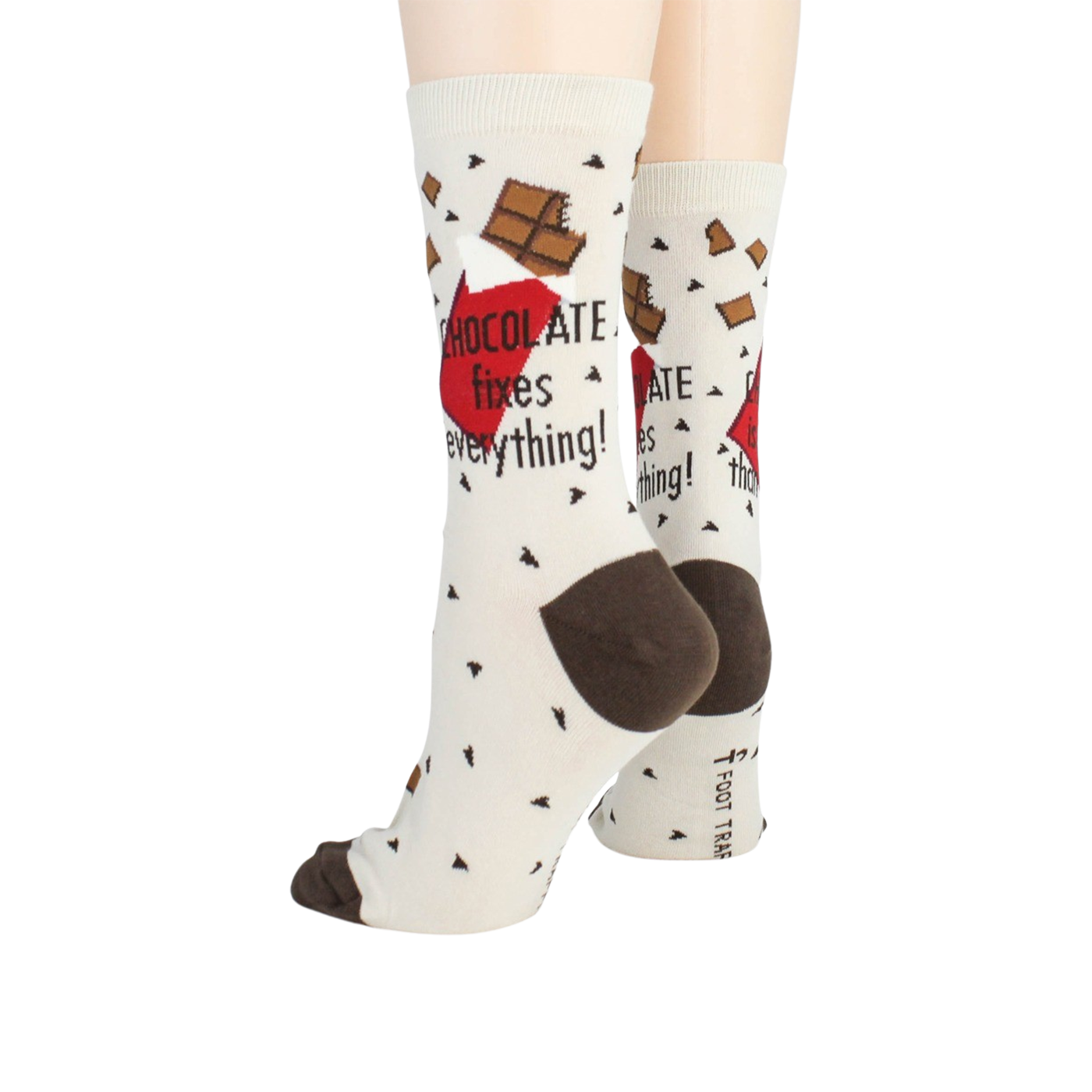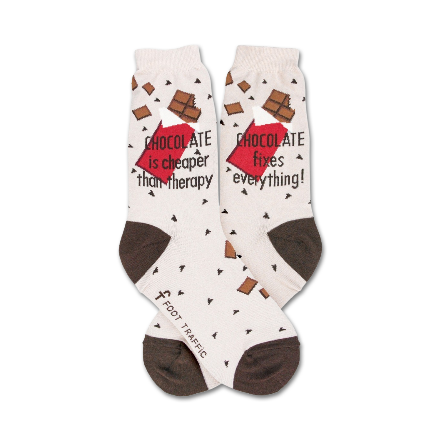 Calling all chocoholics! Treat your feet to a sweet adventure with our Chocolate Crew Socks! Adorned with white socks, brown polka dots, and the uplifting messages of 'Chocolate is cheaper than therapy' and 'Chocolate fixes everything!', these socks will satisfy your cravings for fashion and fun.