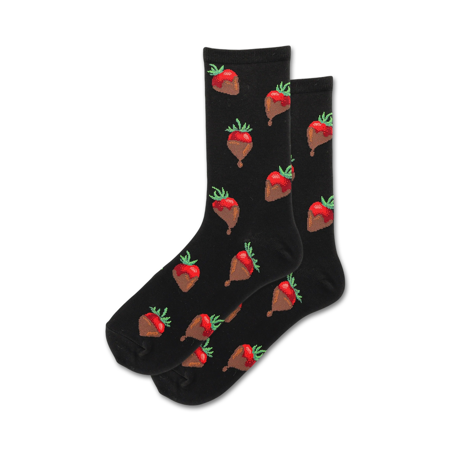 Calling all chocoholics! Satisfy your sweet tooth with these black crew socks covered in red strawberries dipped in rich, melted chocolate. You'll practically want to take a big bite out of these socks, even though we don't recommend it. Fun Fact!: Did you know that chocolate has been used as currency by the Aztecs and Mayans! So, slip on these socks and feel like royalty next time you're craving something sweet.