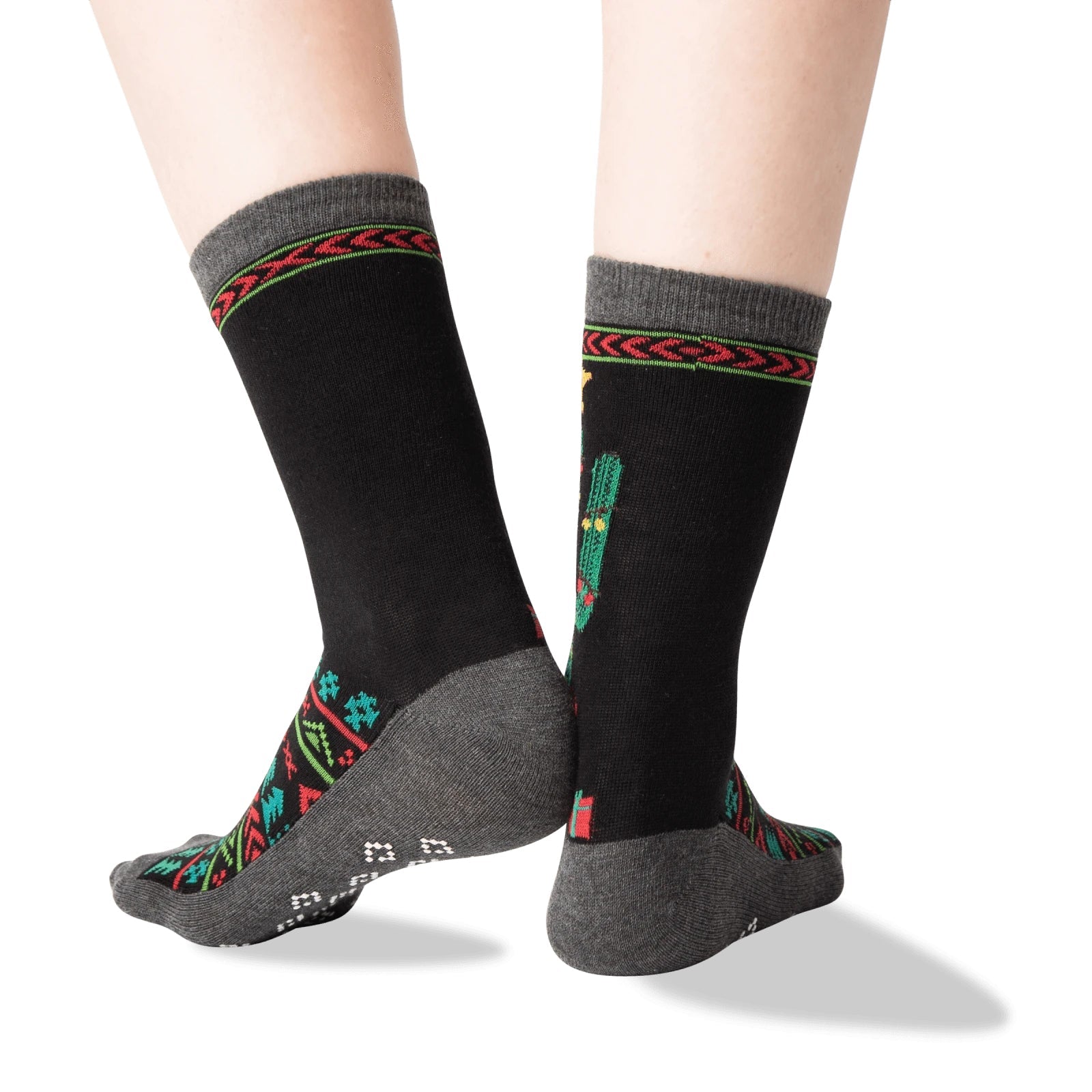 These Christmas Cactus Non-Skid Slipper socks are seriously cute. The main part is black with a festive cactus decked out as a Christmas tree. It's sitting in a pot with presents at the base. The bottom of the sock shown has a gray cuff and a fun, geometric pattern in teal, red, and green. There are also non-skid grips on the bottom, perfect for those chilly Christmas mornings. They're comfy and fun- who needs reindeer when you have a cactus?