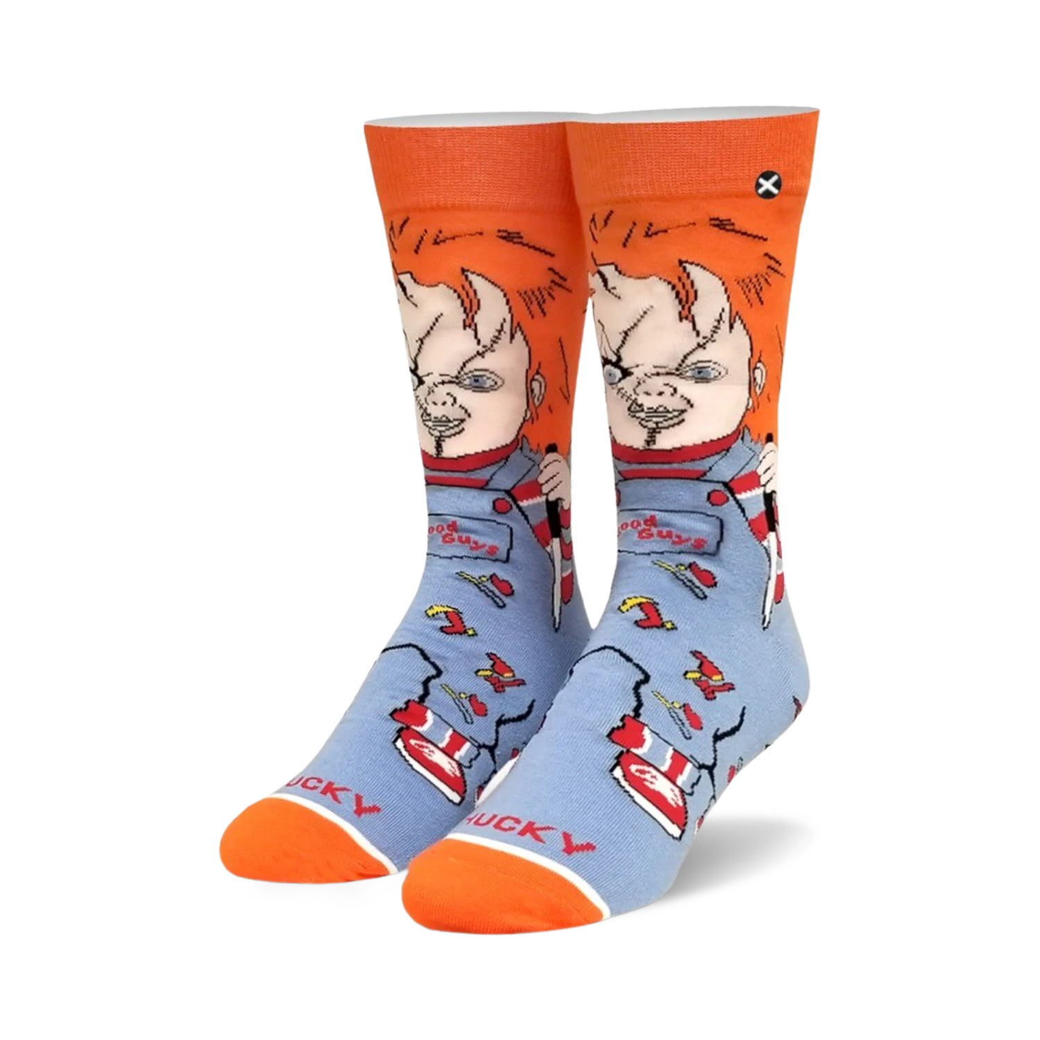 Calling all Chucky fans and horror movie enthusiasts! Add a touch of playful fear to your sock drawer with these "Chucky Good Guy" novelty socks. With Chucky's iconic face glaring at you from your feet, these socks will make you the life of the party (or the haunted house). Wear them to your next horror movie marathon, or just to add a spooky touch to your everyday style. One thing's for sure, these socks are sure to turn heads and make people scream (with laughter, of course)!