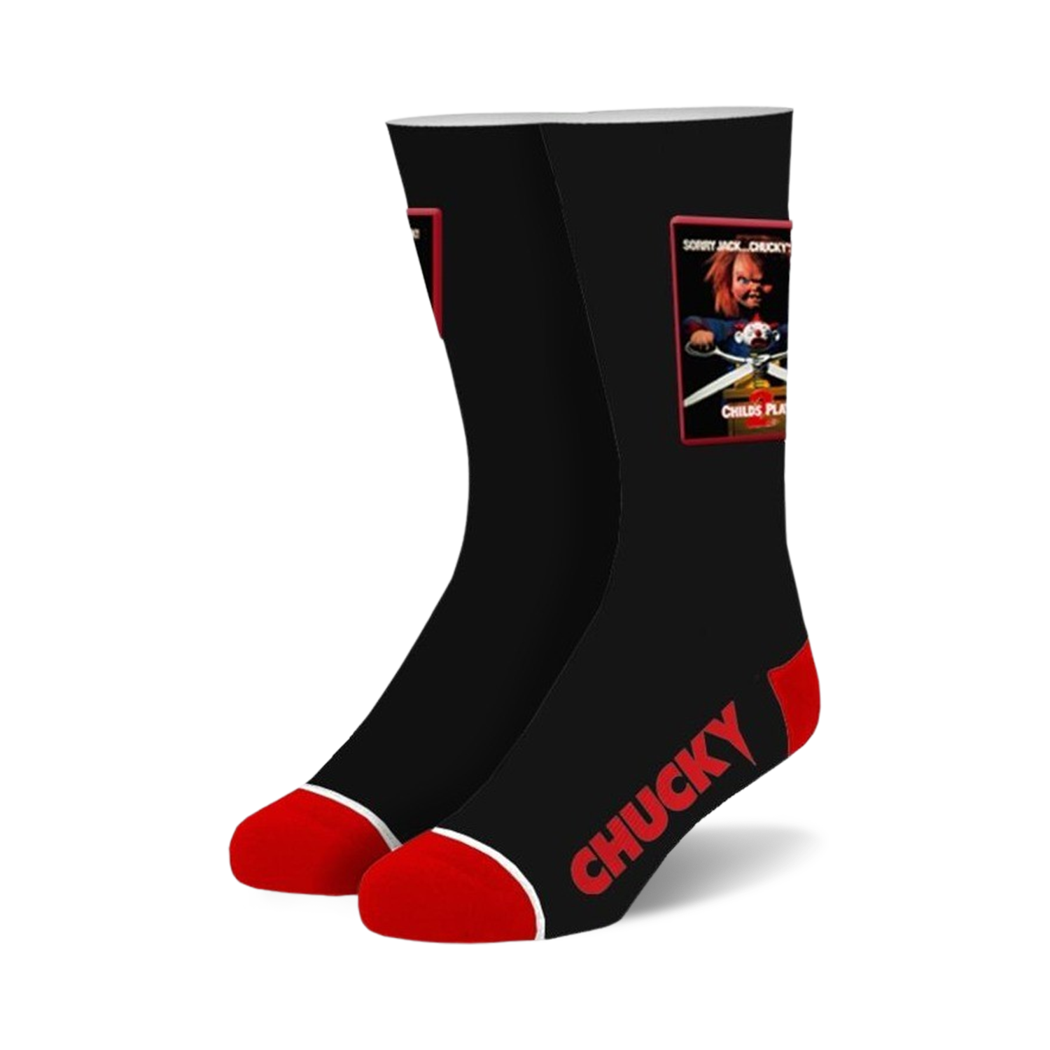 Channel your inner horror fan with these wicked Chucky Patch socks! Featuring a striking black and red design, these socks showcase a large patch emblazoned with the iconic Chucky, complete with his overalls and menacing smile. Perfect for both men and women, these crew-length socks are a must-have for movie buffs and horror enthusiasts. Get ready to bring some spooky style to your feet!