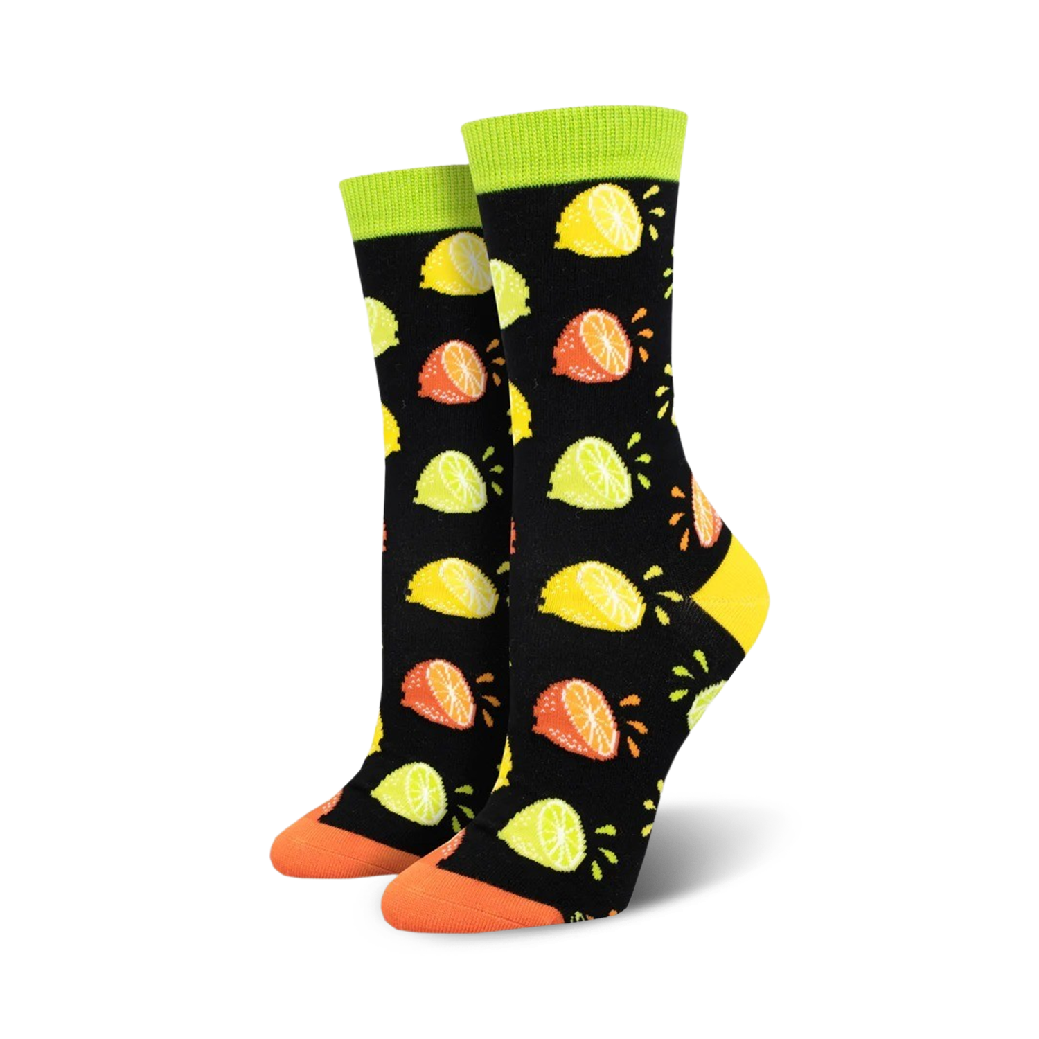 Squeeze some zing into your sock game with our Citrus Squeeze Bamboo Crew Socks! These sweet kicks are bursting with juicy lemons, limes, and oranges on a black canvas, finished with a cheerful green cuff and a zesty orange toe. Get ready to add a refreshing pop to your everyday style!