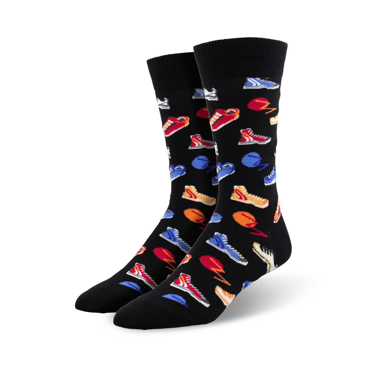 Looking for some off-the-court style? Classic Kicks crew socks bring all of your favorite things about basketball, tennis, and sneakers into one groovy sock. These black socks are dribbling with fun and feature a playful pattern of colorful sneakers, basketballs, and tennis balls. Lace em up and pair these with your best kicks or favorite athletic shorts, and get ready to dunk on the competition!