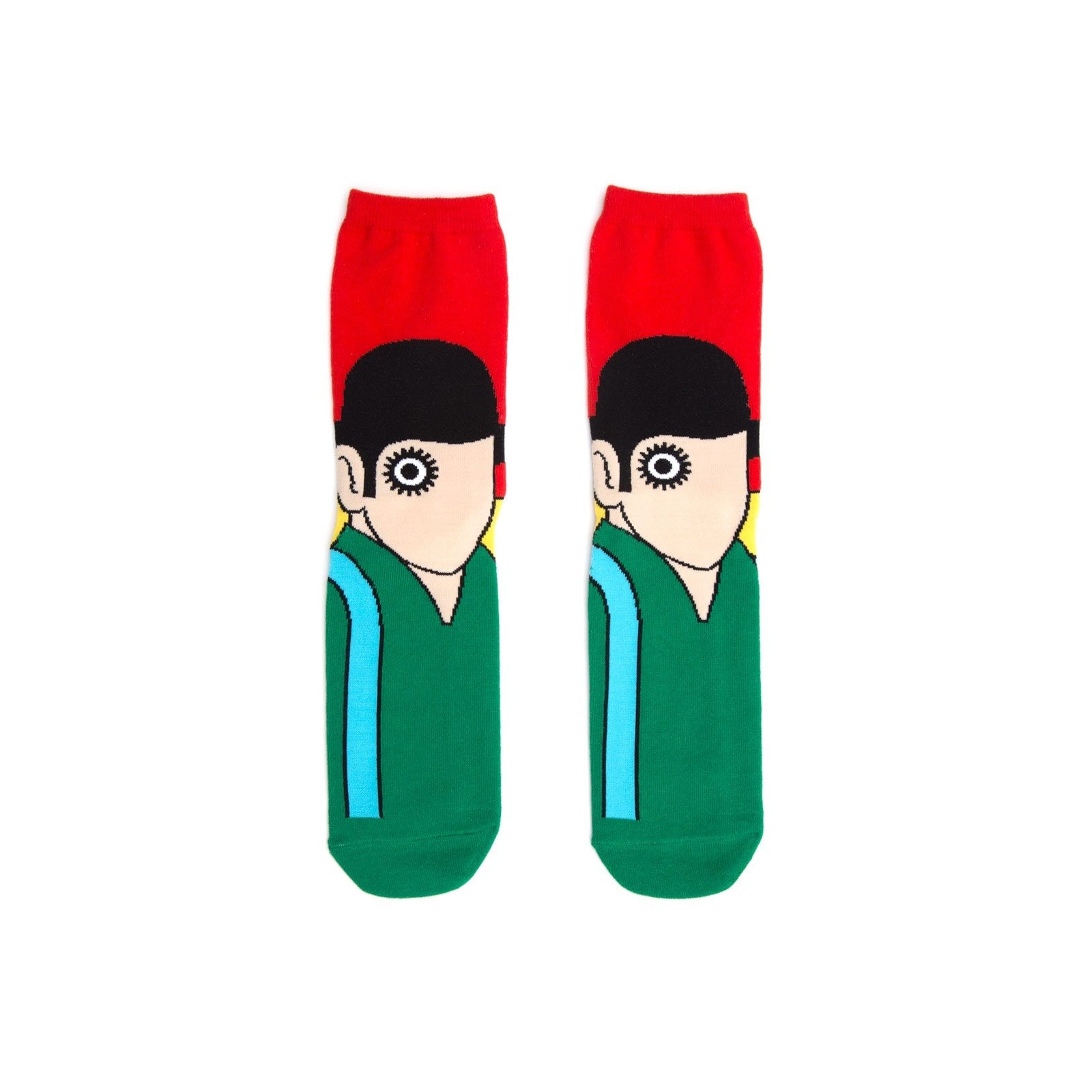 Step into a world of futuristic fashion with our Clockwork Orange socks! These red and green crew socks feature a portrait of Alex DeLarge, the iconic character from the movie. Show off your love for art and literature with these fun and stylish socks. Perfect for men and women who appreciate unique and eye-catching fashion.