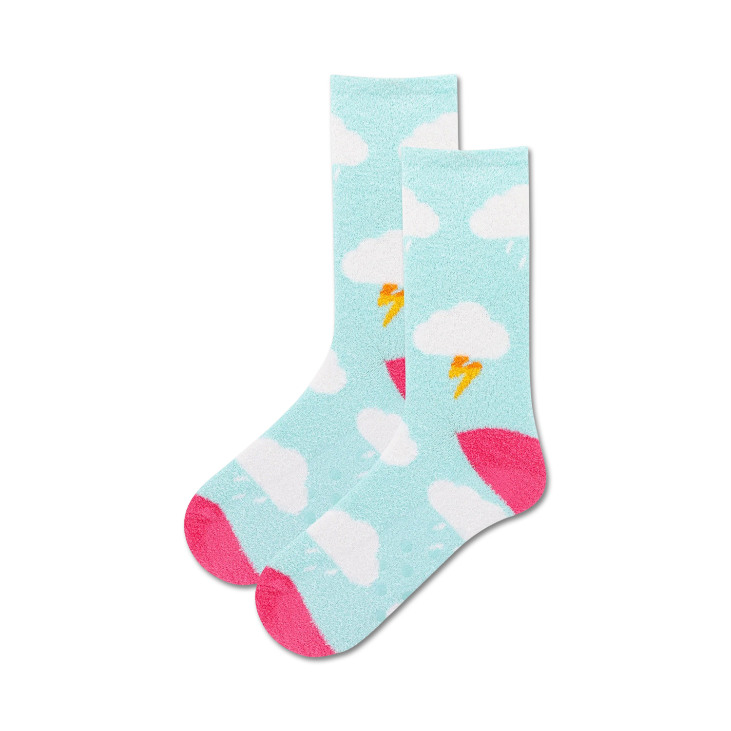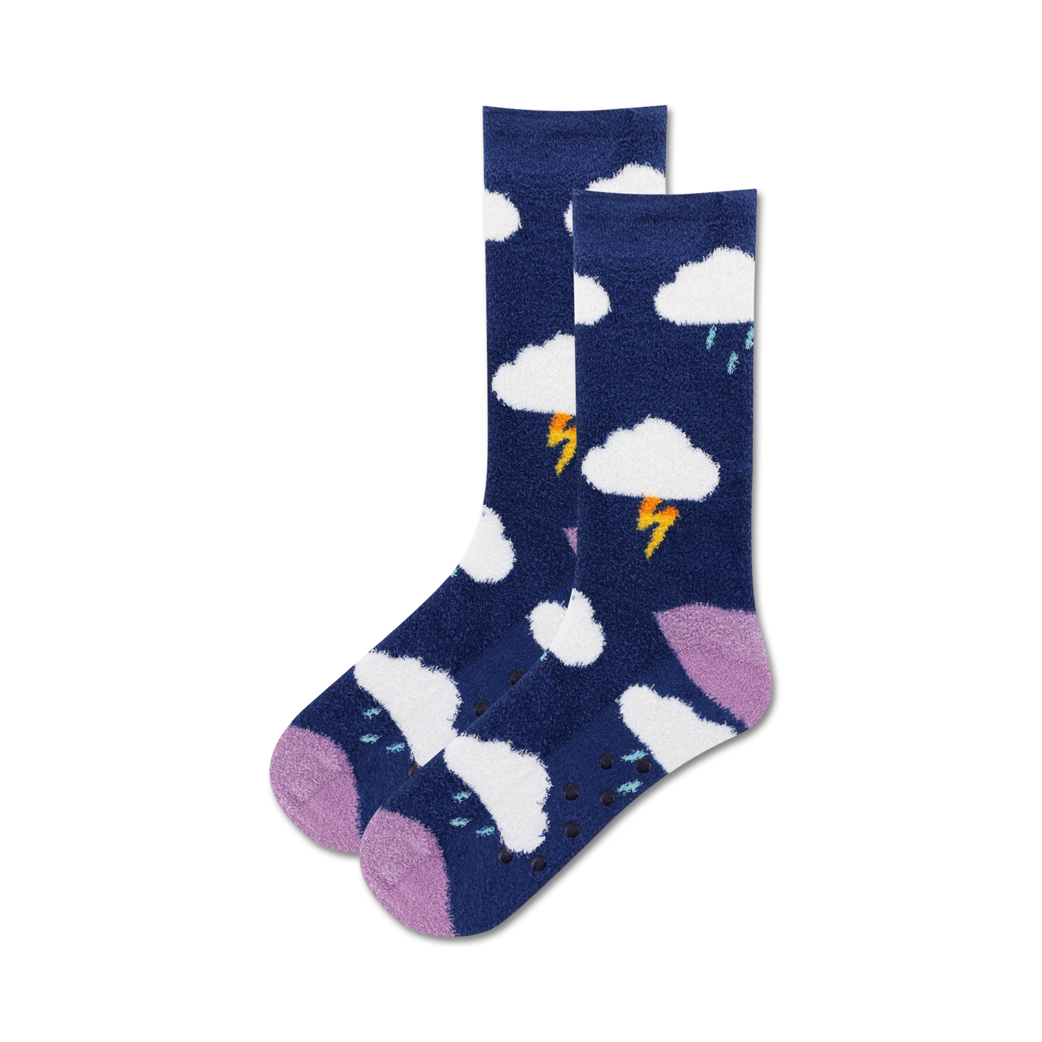 Meet the Clouds Non-Skid Socks, a divine union of comfort and whimsical design. Adorned with fluffy white clouds, energetic yellow lightning bolts, and serene lavender raindrops, they're a tribute to the ever-changing sky. Plus, the purple toes and heels add a touch of playfulness, while the white non-skid circles keep you grounded. Get ready to make a storm every time you step out in these crew socks designed for the goddesses among us. Prepare to be sky-high with joy while you strut your stuff in these celestial creations!