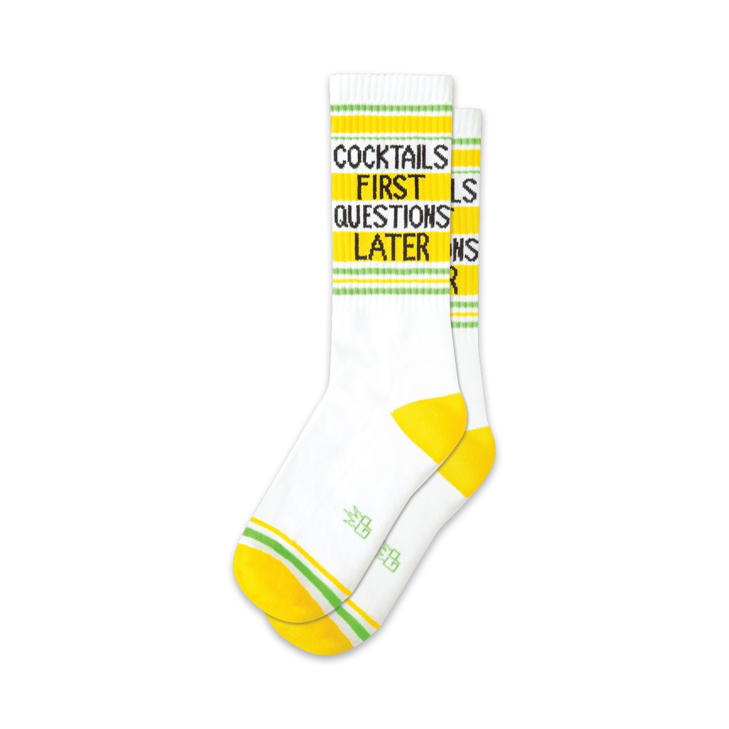Cocktails First Questions Later Socks: Raise a glass to these boozy beauties! "Cocktails First, Questions Later" socks are the perfect accessory for your next happy hour. These crew socks are made for both men and women and feature white fabric with a black and yellow text design that reads "Cocktails First...Questions Later". Add two green stripes and a yellow toe and heel, and you've got a pair of socks that are sure to get you in the party spirit. And remember: when life gives you lemons, add vodka!