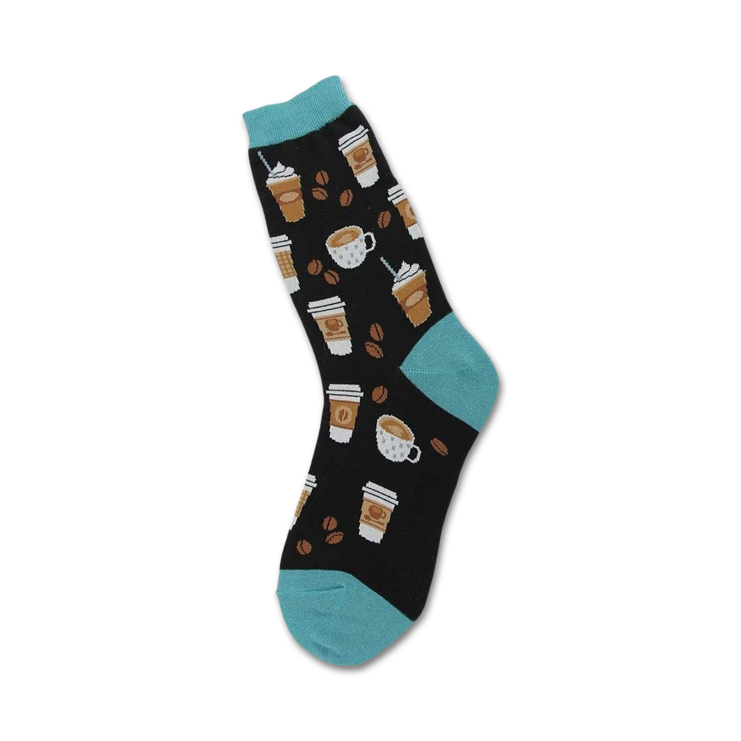 Strut with a spring in your step when you rock these java-themed crew socks boasting a captivating pattern of white coffee cups filled with brown liquid and brown coffee beans, all set against a captivating blue backdrop. The toe and heel are also blue, adding a touch of whimsy. Perfect for the coffee lover in your life, these socks will keep your feet cozy and caffeinated all day long. Whether you're sipping a latte, brewing a pot, or just dreaming of that perfect cup, these socks will make you feel like you're at your favorite coffee shop.