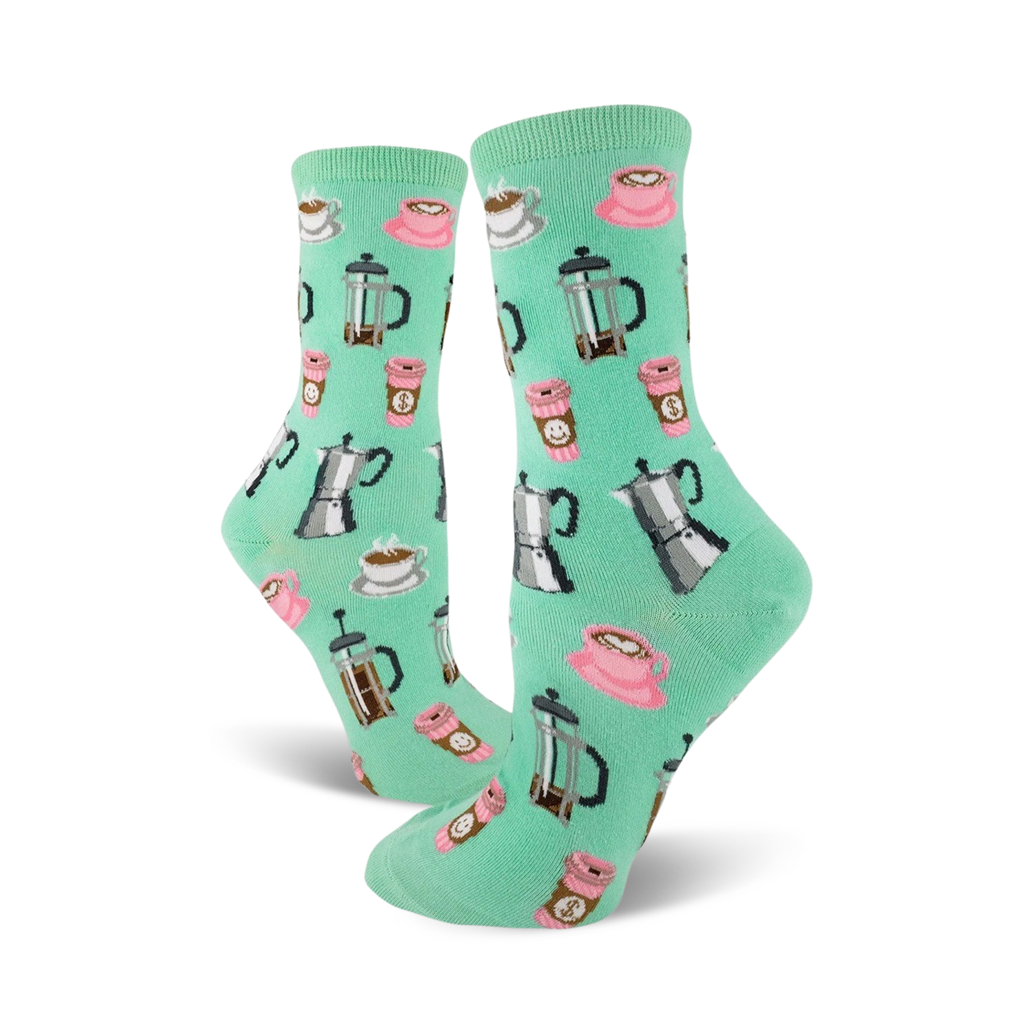 Kick-start your day with these coffee-themed novelty crew womens' pink and brown coffee break novelty crew. With patterns of pink and brown coffee mugs, brown coffee pots, and green French presses, your feet will look lively and refreshed. These lively, lovely, and springy coffee break style novelty crew women's sock collection is perfect for any wardrobe and any day, and even any time of day for that matter!