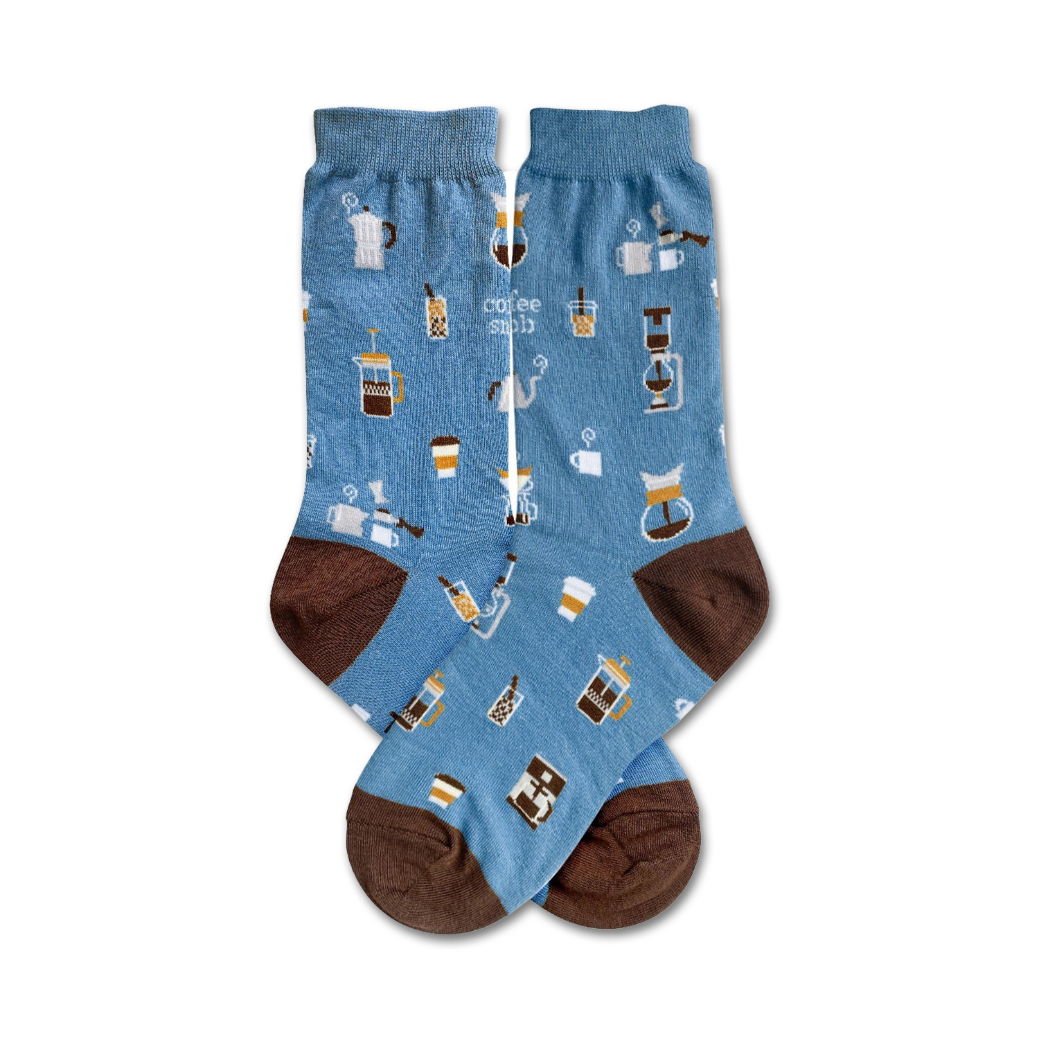 Coffee Snob Crew Socks: Wake up and smell the fashion! These blue crew socks are not just for java lovers, they're a style statement. With coffee beans, mugs and pots in bright shades of coffee and cream, they're sure to perk up your day. They say, "I run on coffee and sarcasm, preferably at the same time!"