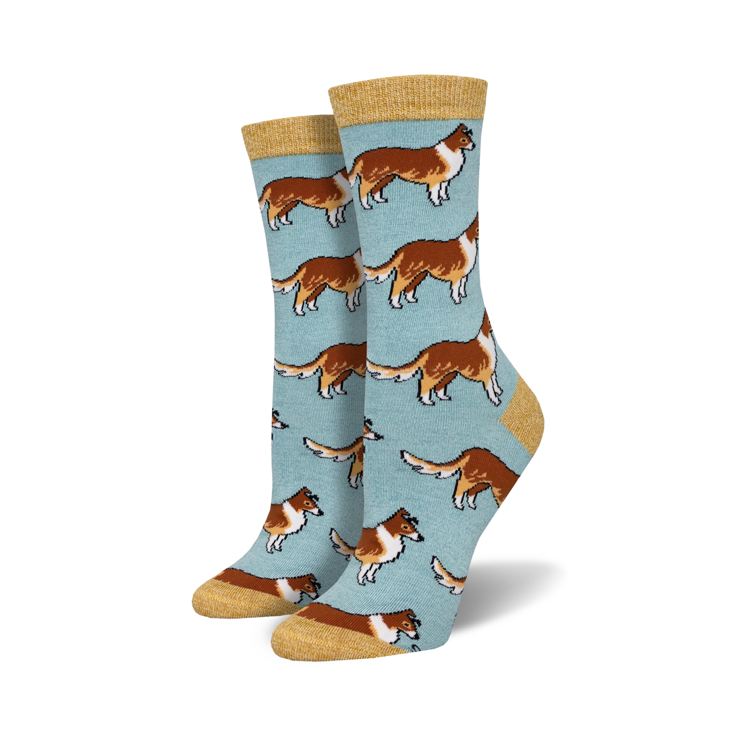 Collies Bamboo: The dog lovers' dream sock! From the land of the Lassie comes these collie crew socks that will have you herding compliments wherever you go! They're blue with a pattern of brown and white border collies letting everyone know you're a true dog person. These soft and comfy socks are perfect for a day at the park, a hike in the woods, or just lounging around the house.