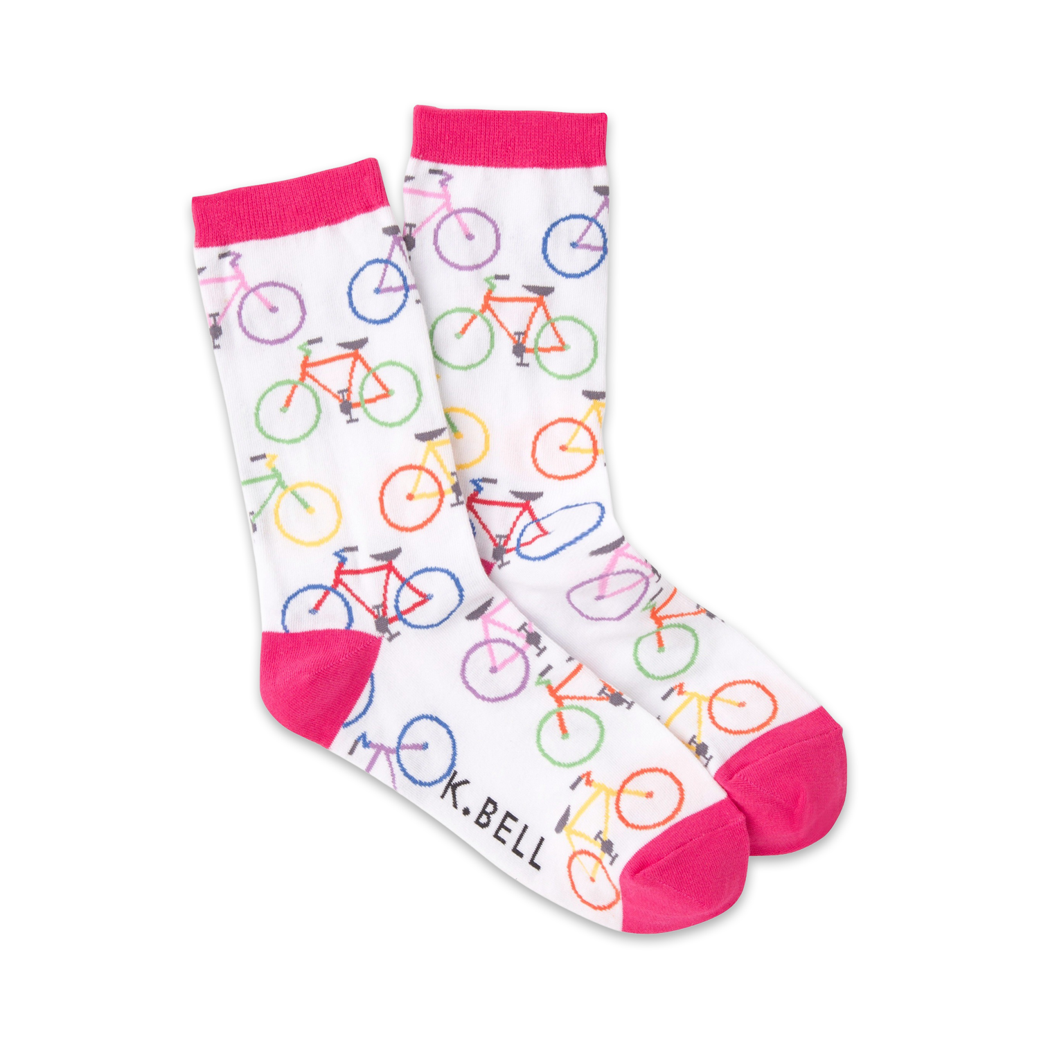 Show them all what kind of trooper you are. When you got places to go, it is no gas, all ass! This cool pair of white and pink crew socks features a pattern of brightly colored bicycles. Buy a pair and wear em'. You'll have a wheely great day!