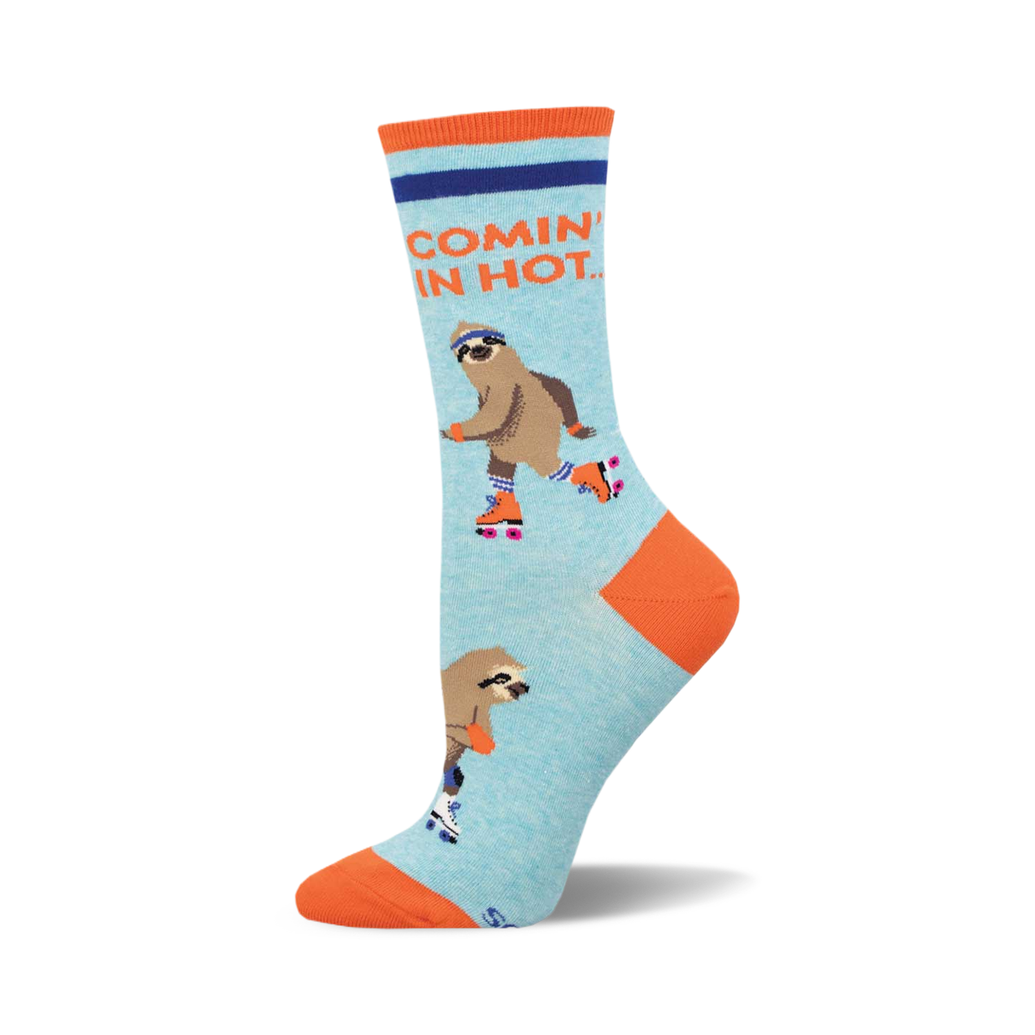 Ditch the rush, embrace the sloth! Our latest pair of blue crew socks are perfect for those who like their style served with a side of cheek. Featuring a rollerskating sloth (yes, you heard right) sporting a snazzy headband, these socks are all about making slow look cool. Adorned with vibrant orange accents on the toe, heel, and cuff, and boasting the bold proclamation "Coming in Hot..."ironically, of coursethese socks are a playful nudge to take life at your own pace. Who knew leisure could look this lively?
