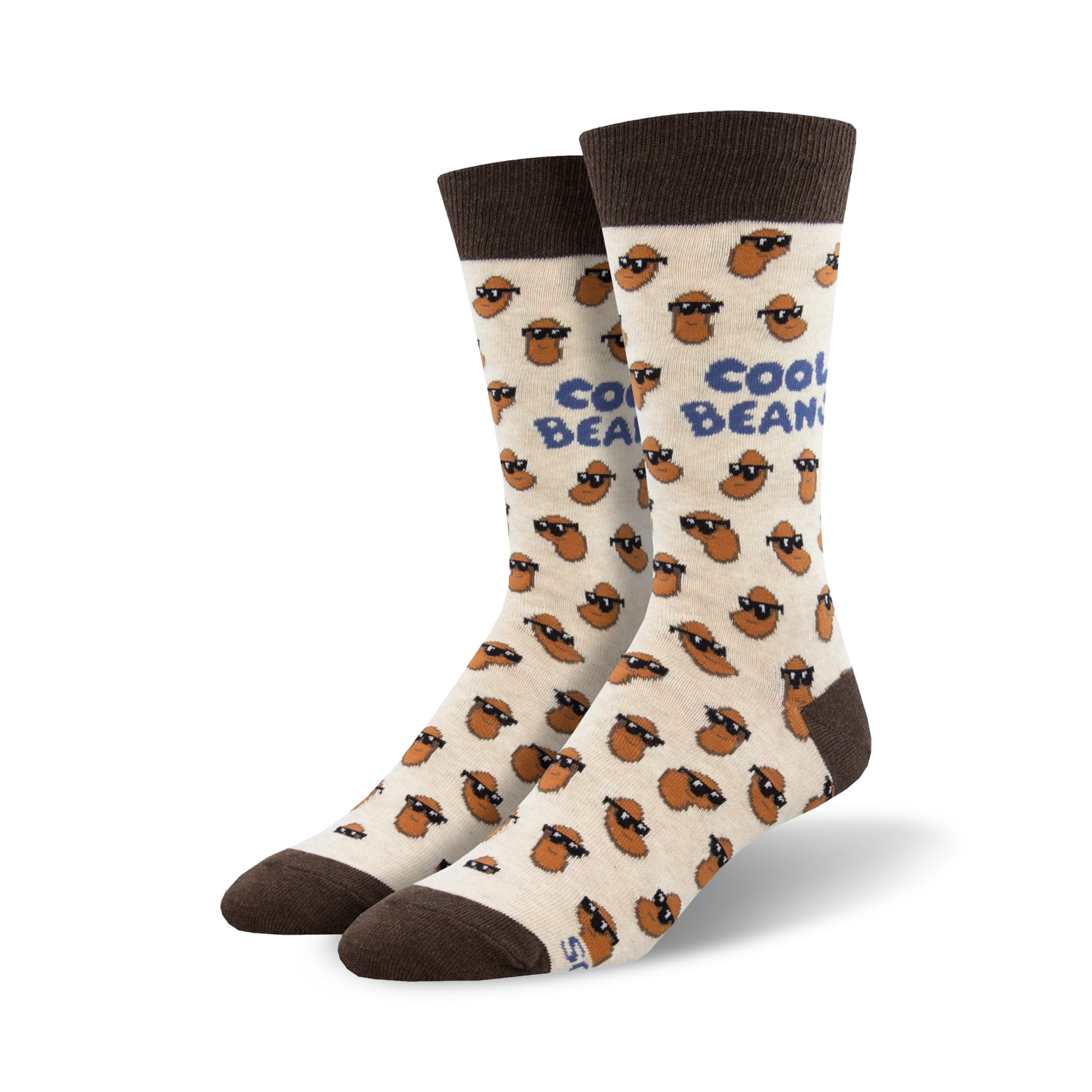 Kick back and relax with these Cool Beans socks, they are sure to put a smile on your face and those around you. Grab your shades and strut your stuff showing off these white socks with brown tops featuring a pattern of cartoon beans chilling out. If you're looking for a fun and quirky way to show your love for coffee and good vibes, these socks are the perfect choice. Made from a blend of fluffy cotton, stretchy spandex, and durable nylon, these socks are comfy enough to wear all day long. Chill out, relax, and enjoy a cup of joe while showing off your cool beans!