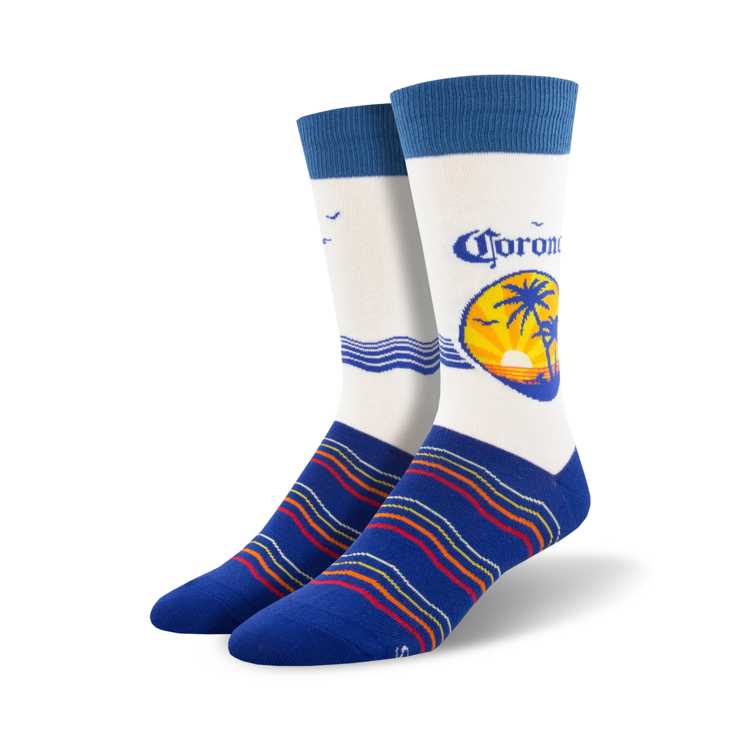 Chill like an islander and make your feet the toast of the town with Corona Palms. While they may not be served in a neon-filled taco caddy, these comfy socks still promise to make any cerveza all the more refreshing. With enough blue to make the ocean blush and a palm tree for every thirsty beach-goer, Corona Palms turn your feet into little resorts. Fun Fact: Did you know the glass and bottle designs have been the same since 1933? Let's raise a cool glass to that.