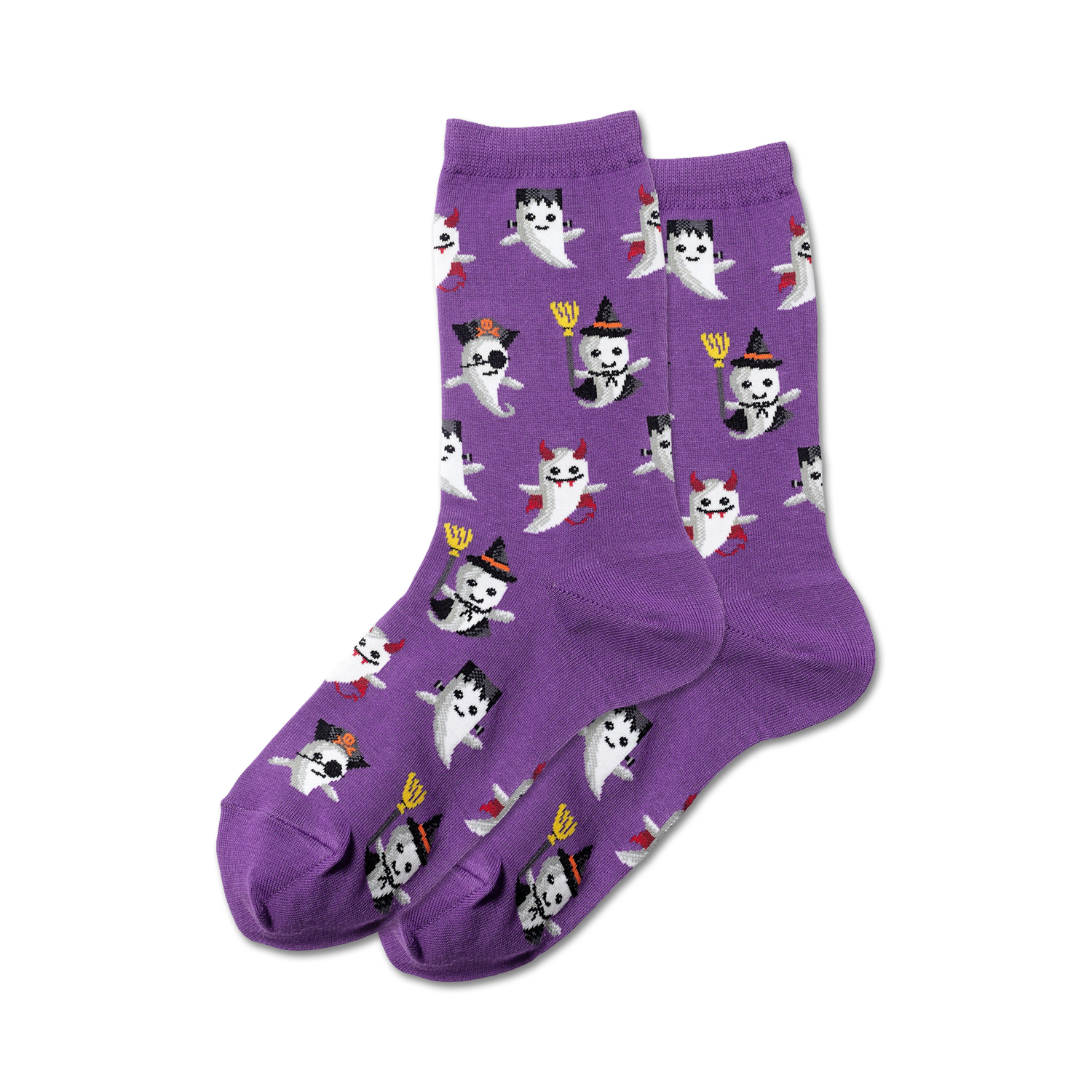 Haunt your feet with Costume Ghost Socks! These purple crew socks feature a playful pattern of white ghosts decked out in witch, devil, pirate, and vampire attire. Perfect for Halloween or any spooky occasion, these socks will ensure your feet have a haunting good time.