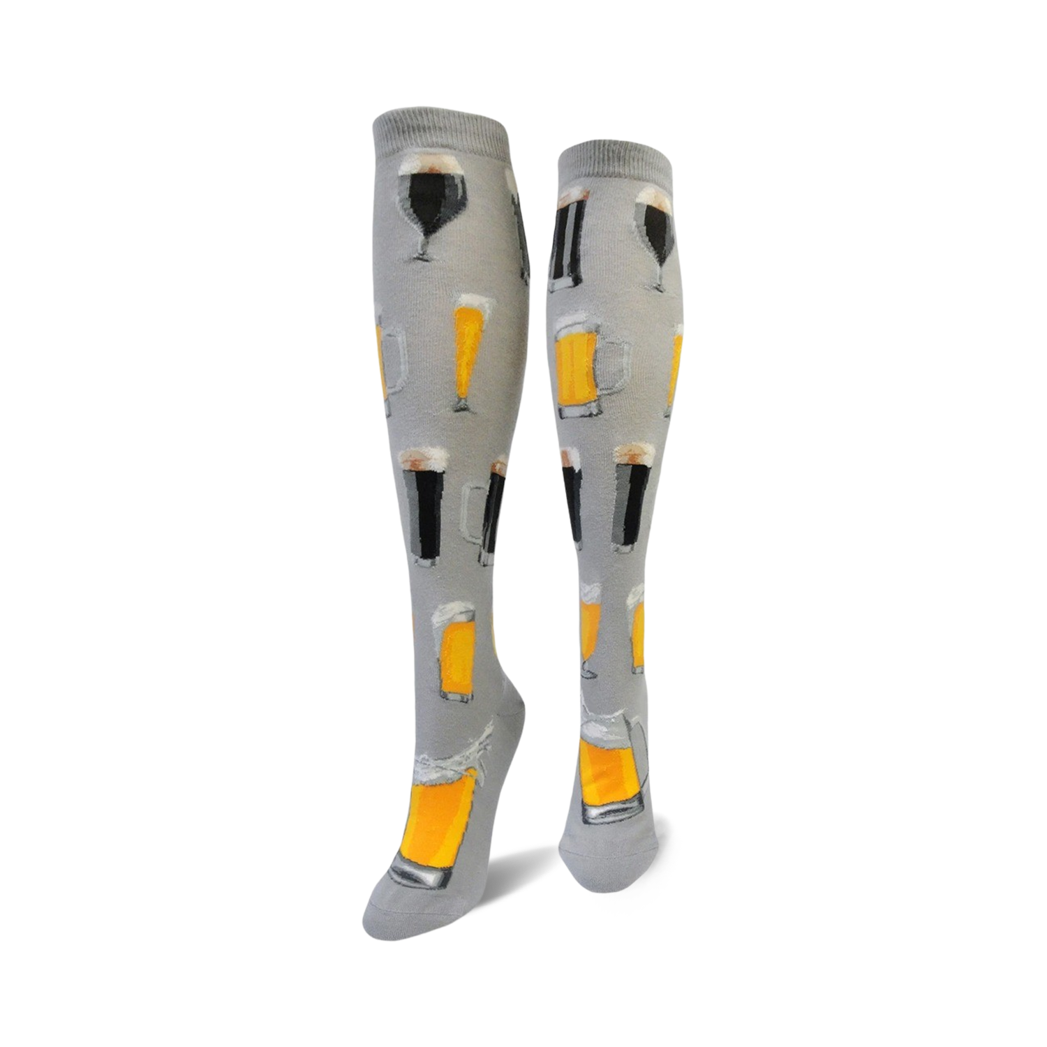 Have a knee-slapping good time with these Craft Beer socks! Show off your love for all things beer with this Knee High Women's gray sock featuring a pattern of light and dark beer glasses and mugs. These socks are so cool, they just might make you foam at the mouth.