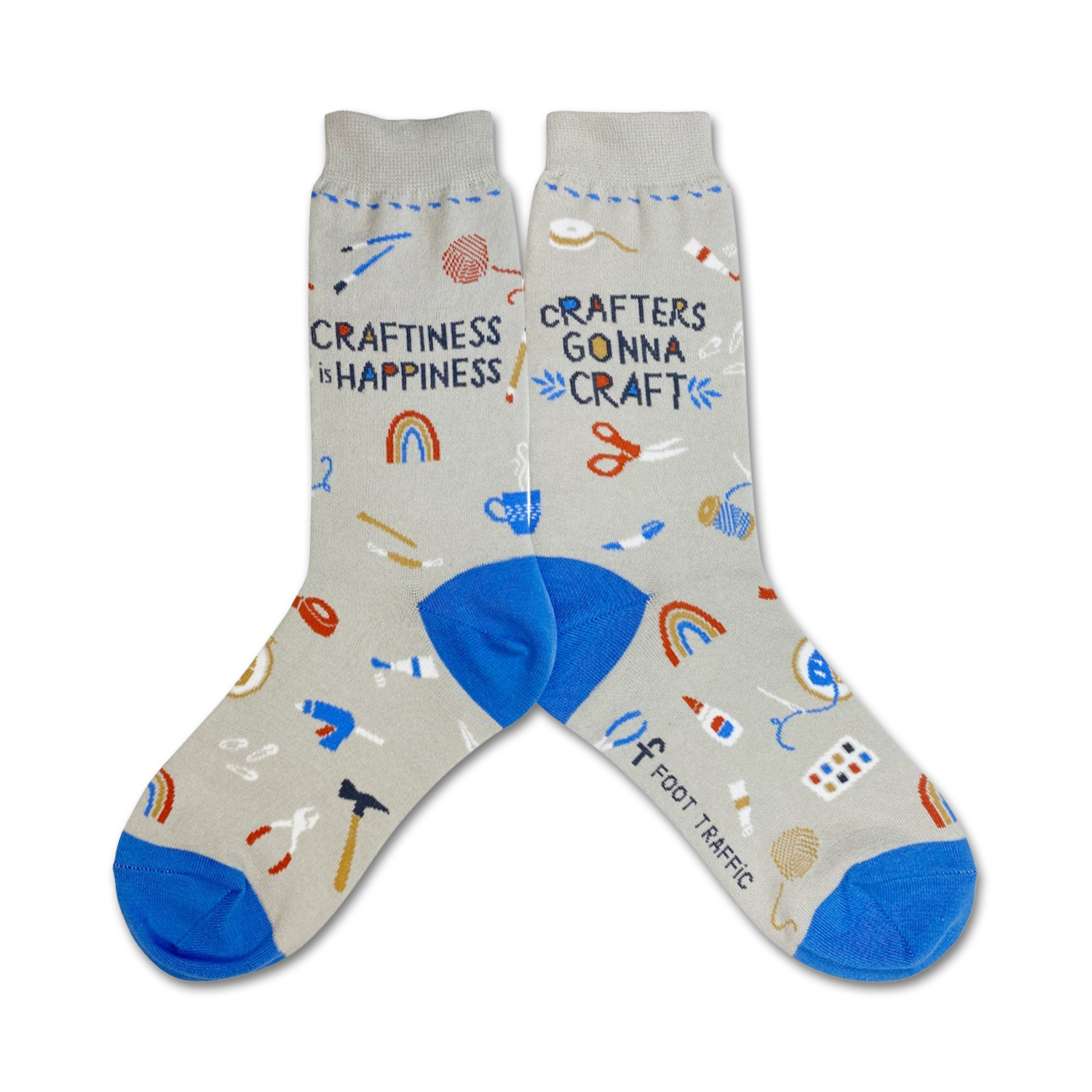 Who says craftiness can't be cozy? Put on a pair of these "Crafts" crew socks and let your feet enjoy the softest yarns and coolest patterns. With their gray base, blue toes, heels, and cuffs, these socks are like a blank canvas just waiting for your next project. And with a rainbow of crafting supplies knit into the design, you'll be inspired to create something amazing.