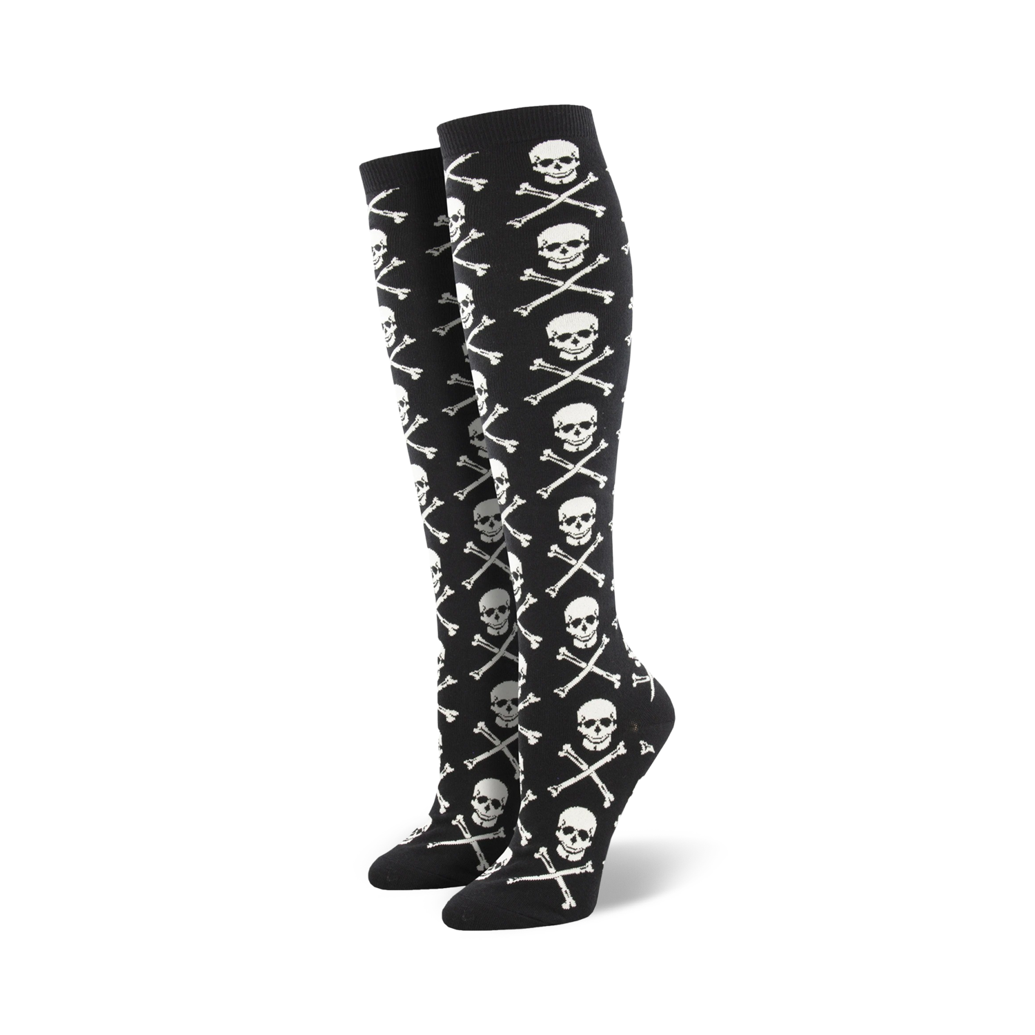 Trick or feet! Show your Halloween spirit with our Crossbones Knee High Socks. Rock a pair of these socks to liven up your Halloween costume, or just to add some spooky fun to your everyday look. With a bold pattern of white skulls and crossbones on a black background, these socks are sure to turn heads wherever you go. They're made with a comfortable cotton blend that will keep your feet happy all day long. Whether you're trick-or-treating, partying, or just hanging out, these socks are the perfect way to add some spooky style to your outfit.