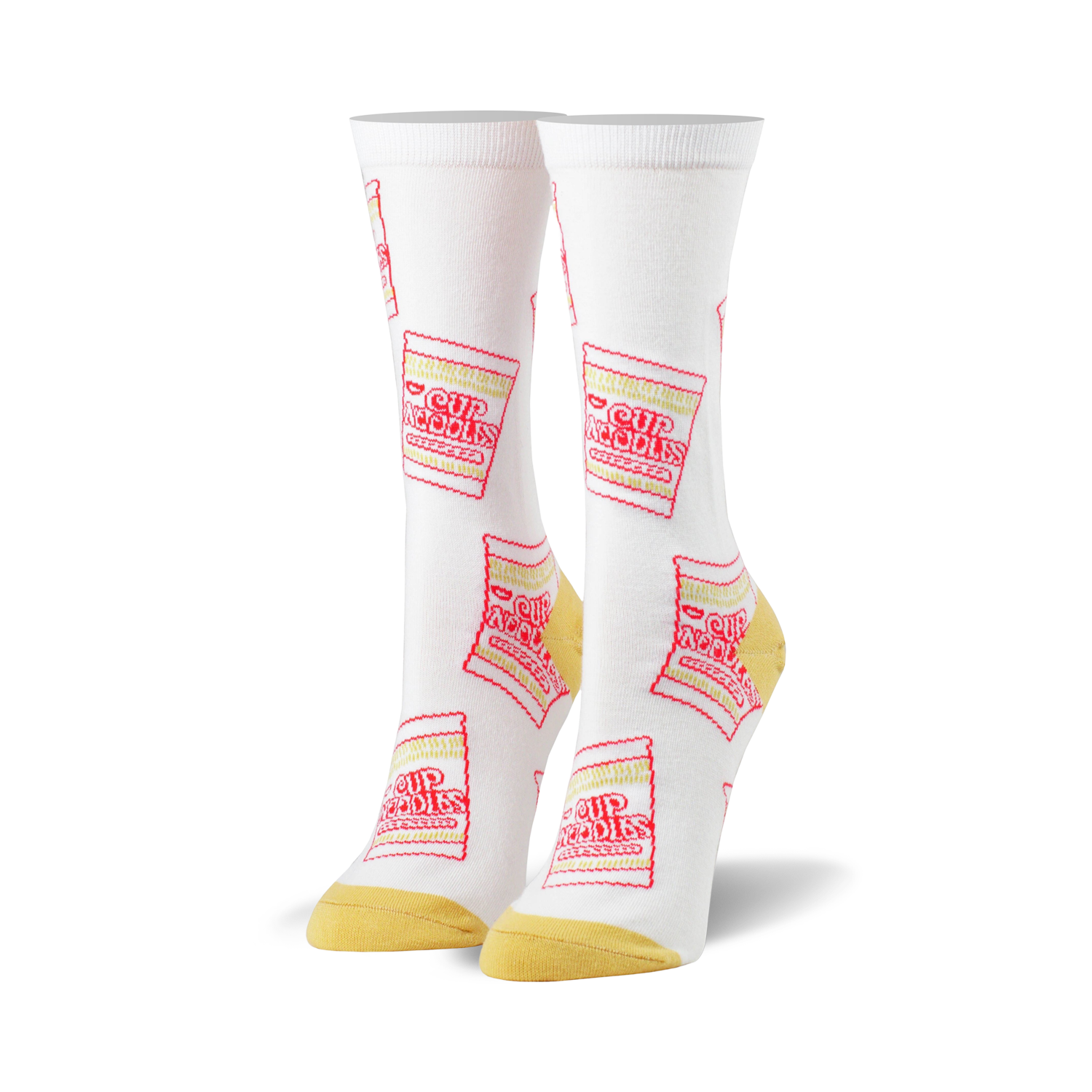 "Cup Noodles fanatics, embrace the taste of fun with our Cup Noodles Cup Crew Socks! These white socks feature an allover print of red and yellow Cup Noodles soup packages, complete with the iconic Cup Noodles logo. Just like the beloved instant noodles, these socks bring a burst of energy to your feet, keeping you comfy and stylish. Show off your love for Cup Noodles and your playful side with every step."