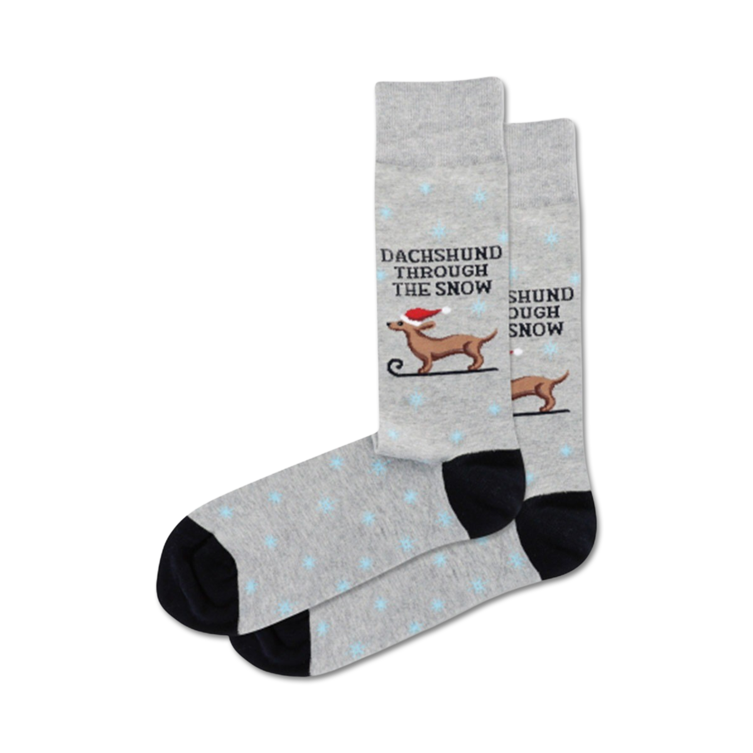 Dashing through the snow, a dachshund goes! Embark on a winter wonderland adventure with these Dachshund Through the Snow socks. With a festive red Santa hat and cartoonish charm, these gray socks with black toes and heels are sure to bring holiday cheer to your feet. Whether you're hitting the slopes or just lounging by the fire, these crew socks for men will keep you cozy and stylish all season long.