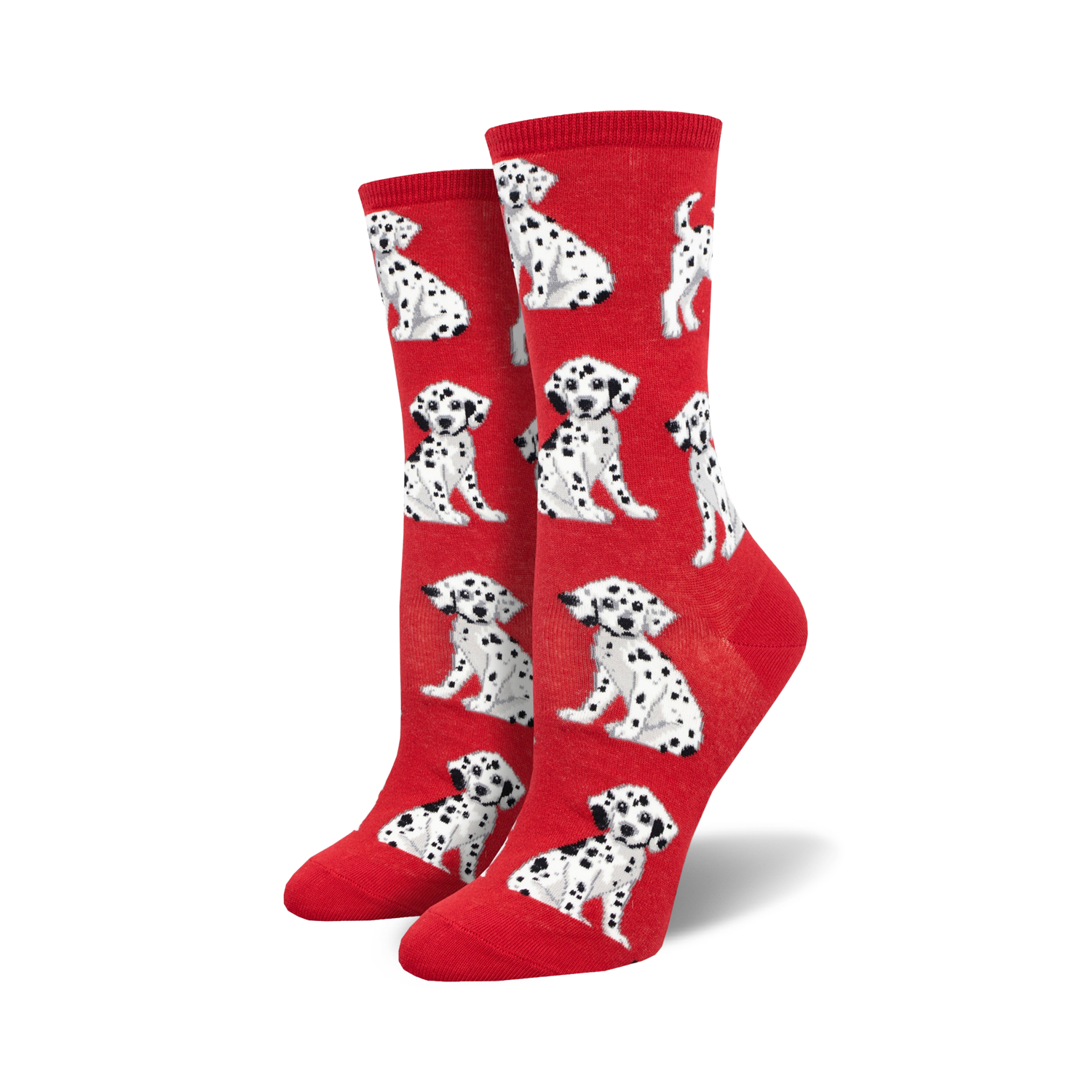 Dalmatian Station puppy dog socks are the pawfect accessory for any dog lover. These fun, red socks feature a paw-rade of cartoon Dalmatian puppies ready to brighten your day. Wear them with pride and show everyone your pup-ularity! Fun Fact: Did you know that Dalmatians are born without spots? They usually start to appear within a few weeks.
