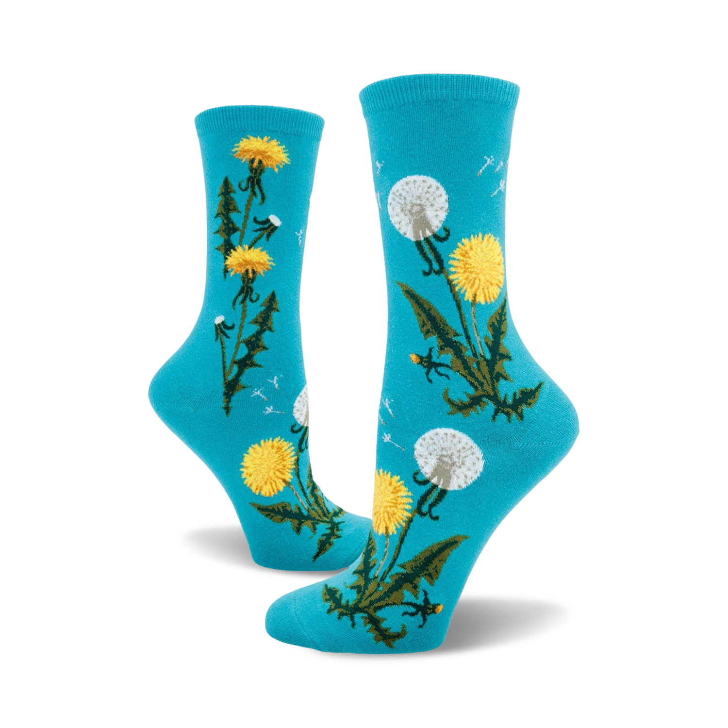 Dandelion socks: The first colorful sign of spring is here! These super cute and comfy crew socks bloom in a bright blue sky of joy with a pattern of white and yellow dandelion flowers with green stems and leaves. Wear a pair of these spirited socks to remind you of new beginnings and a fresh start! Perfect for any occasion, these socks bring a little bit of sunshine wherever you go. Grab a pair today and let your feet flourish!