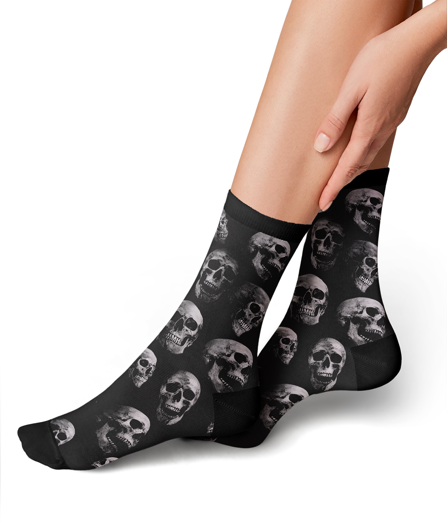 Unveil your enigmatic, darkly romantic essence with a pair of Dark Skulls socks. Add a mysterious flair to any occasion, be it a Halloween bash, a concert, or a fashion statement! Be ready to take on the night with Dark Skulls! Make any ensemble come alive with upscale Seduction. Dare to be different!