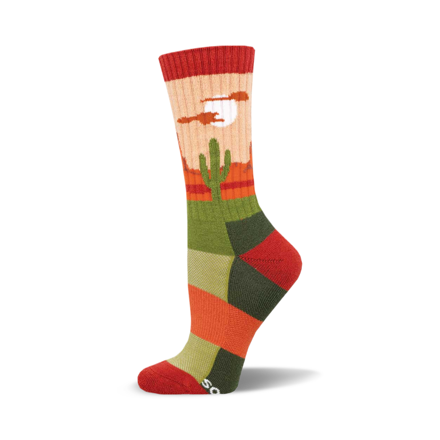 Looking to prick some fun into your wardrobe? Our "Desert Plains" novelty socks are just the thing! Adorned with a cheeky cactus pattern set against a vivid desert backdrop of red, orange, yellow, green, and blue mountains, they are a burst of fun for your feet. Perfect for adding a pop of color to your day or cheering up your office attire. Heading to a barbecue or a casual day out? Don't leave your personality hanging - let it stride boldly alongside you in these vibrant crew-length socks. Why be mundane when you can be striking?