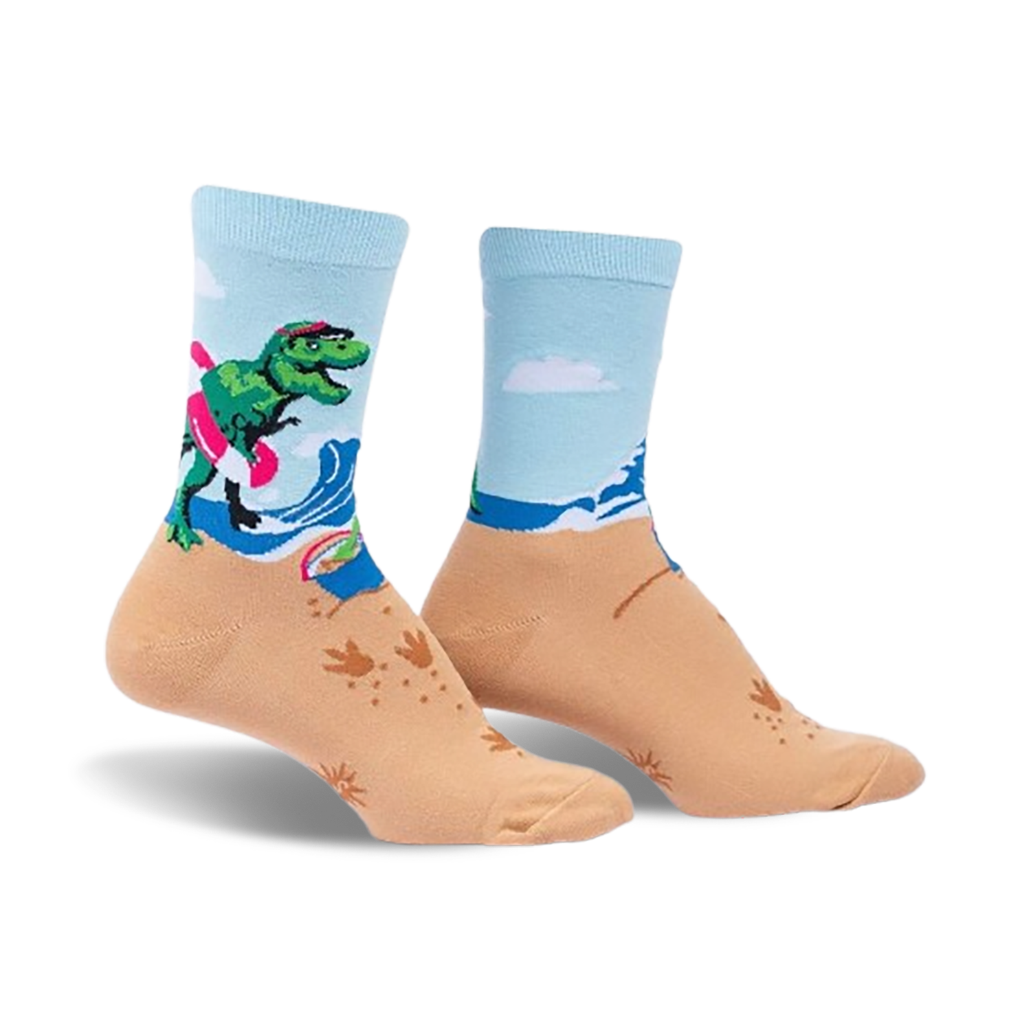 Who says socks can't be the life of the party? Party-saurus Rex and his posse breakin' it down on these Dinos Gone Wild socks! Soft blue shies above a sandy beach, complete with footprints and a stegosaurus ridin' a surfboard in a pink inner tube. And if that doesn't make you smile, maybe learning the name "Stegosaurus" comes from the Greek words for "roof" and "lizard" will.