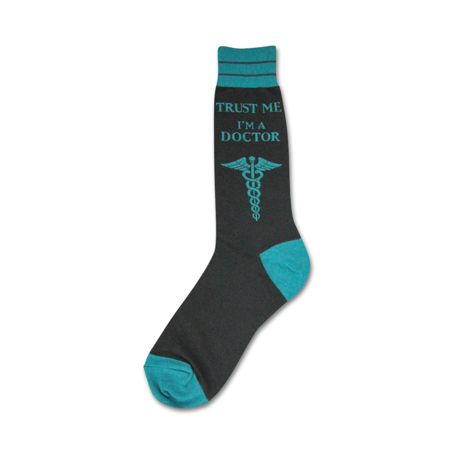 Doctor Socks, pair of black crew socks with turquoise toes, heels, caduceus symbol, and text 'Trust me I'm a Doctor.' These socks are perfect for medical professionals wanting to add a bit of humor to their scrubs or give as a gift to your favorite doctor, nurse, or medical student.
